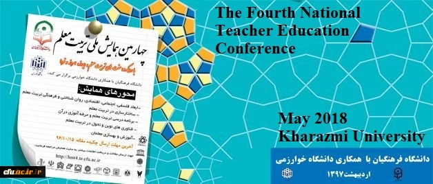 According to the Vice-presidency for Research and Technology of FTEU, the fourth National Teacher Education Conference will be held on May 8 and 9, 2018, along with the commemoration of the teacher's week and coinciding with the hundredth anniversary of the establishment of the first Iranian higher education institute (Daral-e-Taliman) at Kharazmi University.