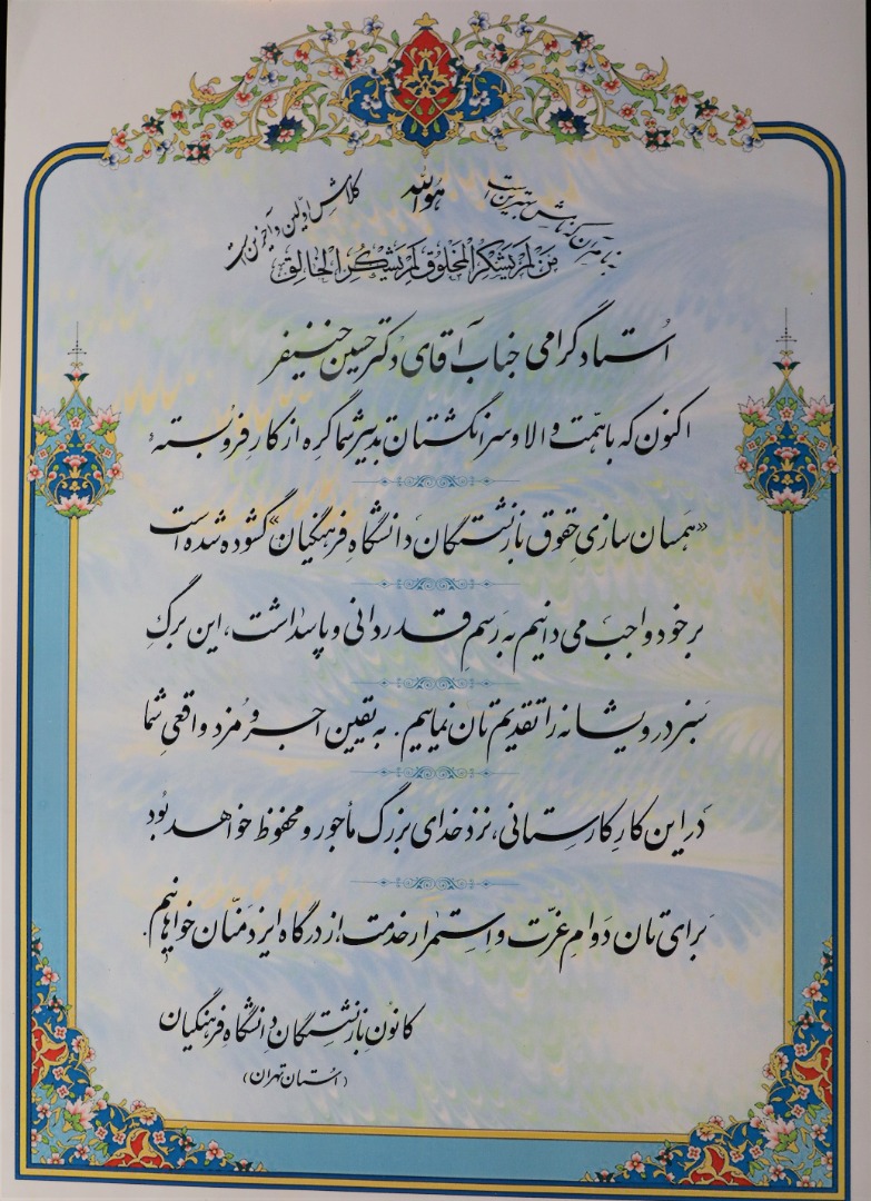 به گزارش روابط عمومی دانشگاه فرهنگیان, به دنبال تلاش پیگیر و مجدانه دکتر حسین خنیفر رییس دانشگاه فرهنگیان در همسان سازی حقوق بازنشستگان این دانشگاه، جمعی از بازنشستگان این دانشگاه با اهدا لوح تقدیر از اقدامات ایشان تقدیر و تجلیل کردند.