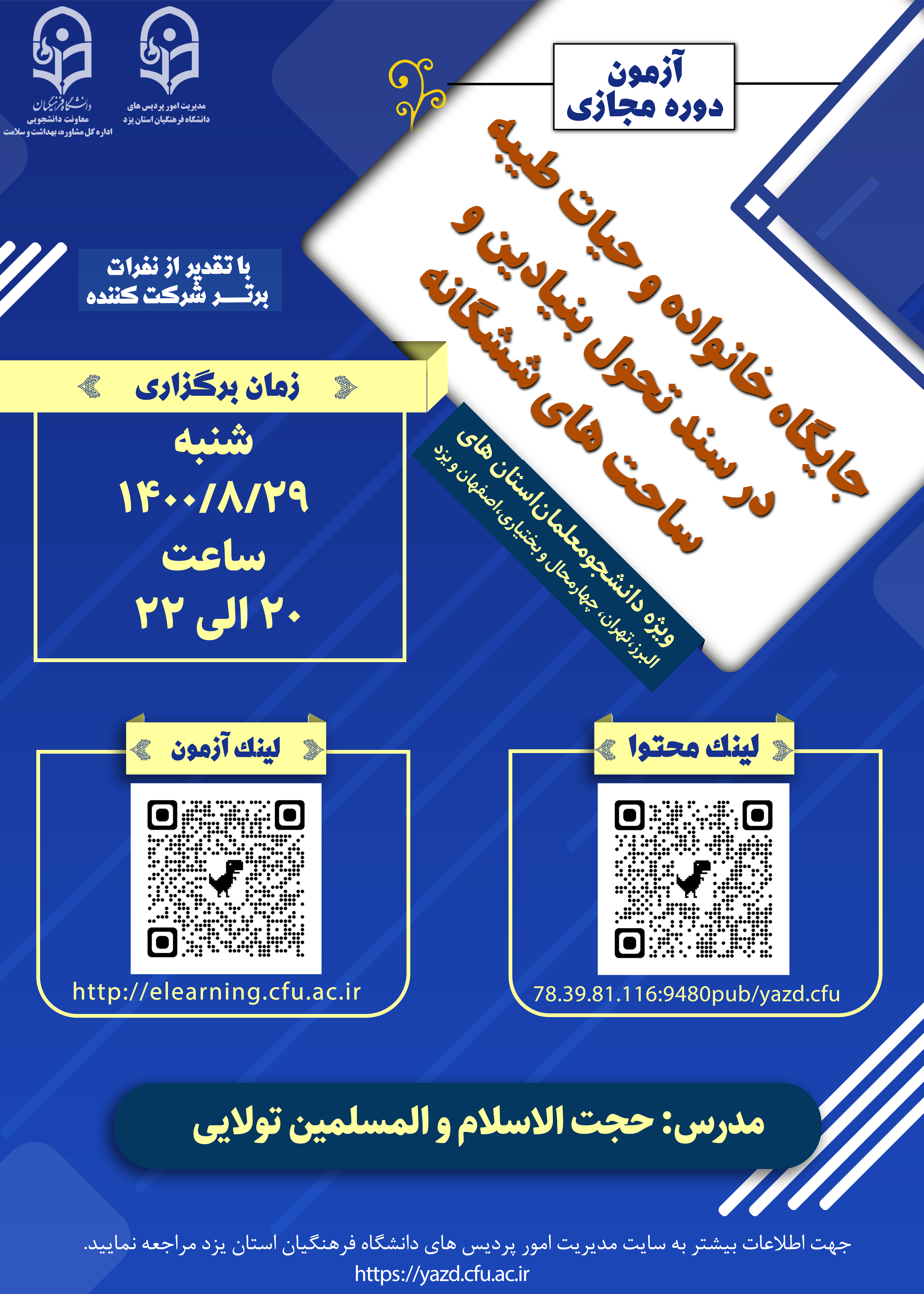 گفتنی است: محتوای آموزشی در فضای ftp به نشانی http://78.39.81.116:9480/pub/yazd.cfu/ قرار گرفته است. آزمون دوره روز شنبه 1400/08/29 در سامانه http://elearning.cfu.ac.ir/ از ساعت 20 الی 22 برگزار می شود.