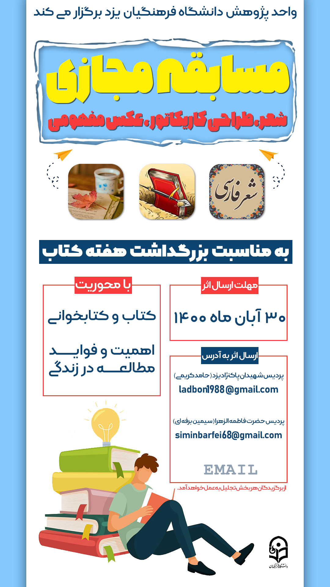 3- برگزاری مسابقه شعر، طراحی کاریکاتور و عکس مفهومی با محوریت کتاب و کتابخوانی، فواید و اهمیت مطالعه در زندگی
