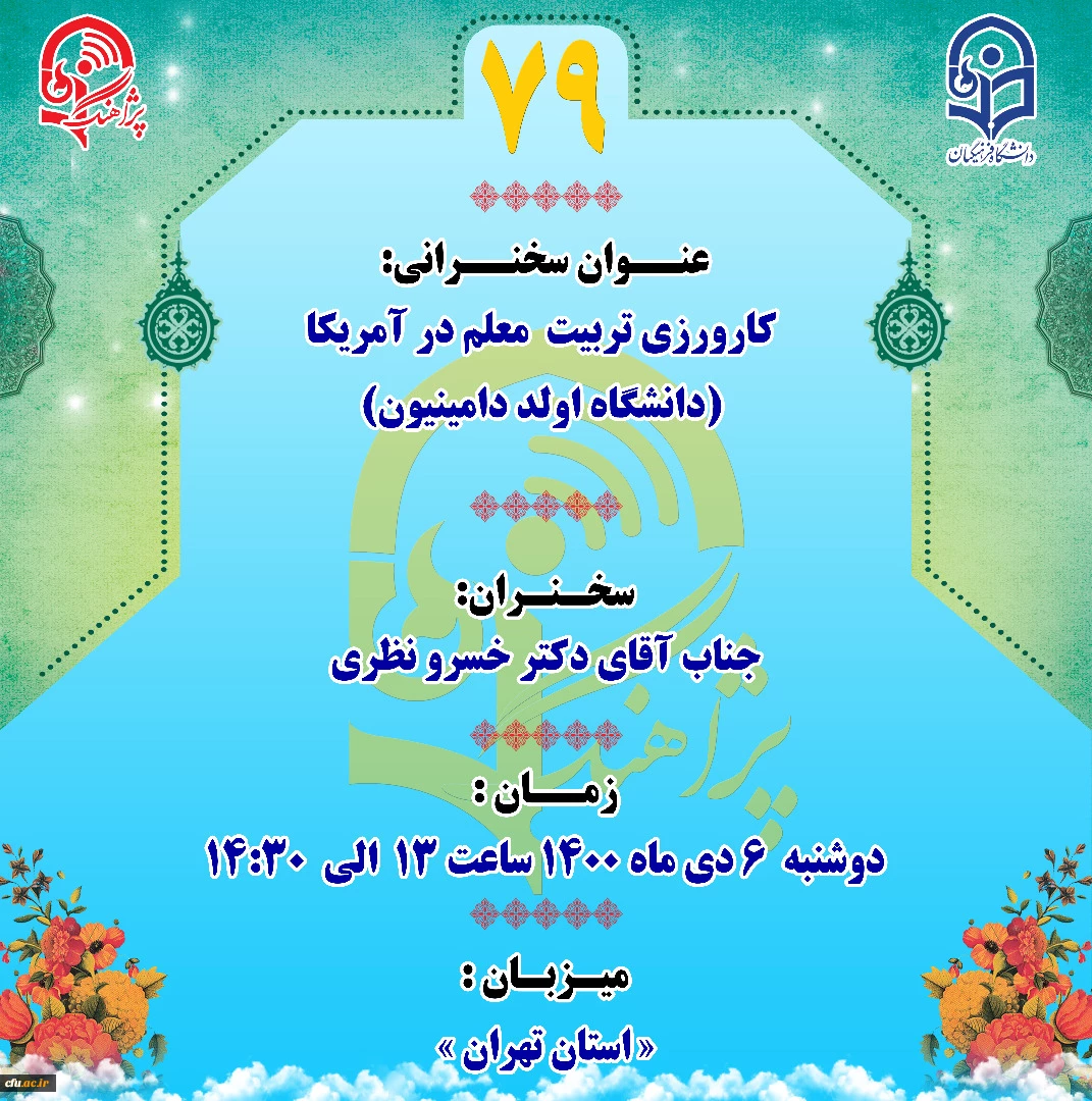 براساس اعلام حوزه معاونت پژوهش و فناوری دانشگاه، در ادامه اجرای برنامه «پژآهنگ»، سخنرانی هفتاد و نهم با عنوان «کارورزی تربیت معلم در آمریکا (دانشگاه اولد دامینیون)» با ارائه دکتر خسرو نظری از استان تهران (سازمان مرکزی) روز دوشنبه مورخ 1400/10/6 از ساعت 13 الی 14/30 به صورت مجازی از طریق سامانه یادگیری الکترونیکی دانشگاه فرهنگیان به آدرس elearning.cfu.ac.ir برگزار شد.
