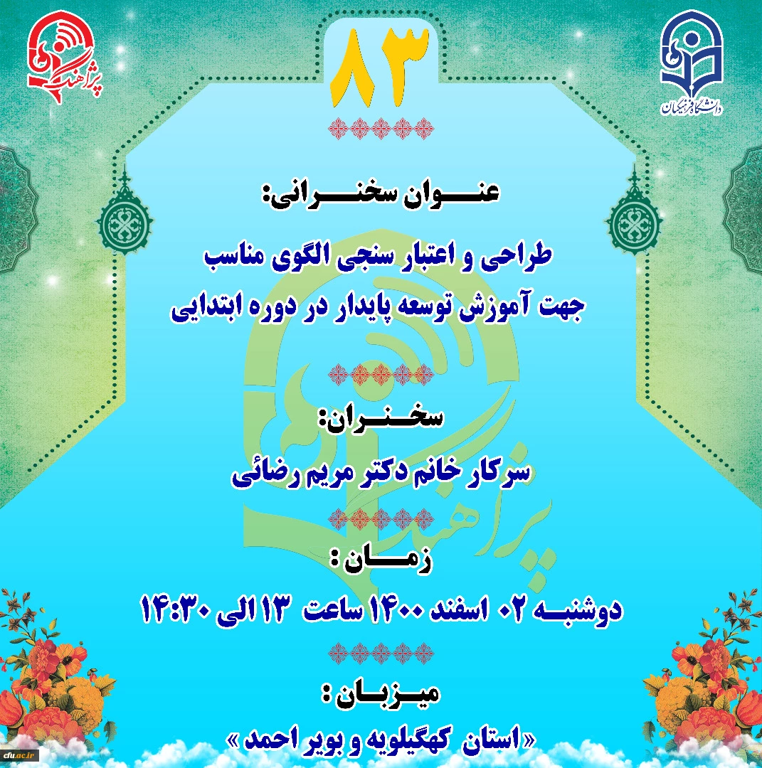 براساس اعلام حوزه معاونت پژوهش و فناوری دانشگاه فرهنگیان، در ادامه اجرای برنامه «پژآهنگ»، سخنرانی هشتاد و سوم با عنوان « طراحی و اعتبار سنجی الگوی مناسب جهت آموزش برای توسعه پایدار در دوره ابتدایی » با ارائه دکتر مریم رضایی از مدیریت امور پردیس های استان کهگیلویه و بویراحمد- برگرفته از رساله دکتری سخنران - روز دوشنبه مورخ 1400/12/2 از ساعت 13 الی 14/30 به صورت مجازی از طریق سامایه یادگیری الکترونیکی دانشگاه فرهنگیان به آدرس elearning.cfu.ac.ir برگزار شد.