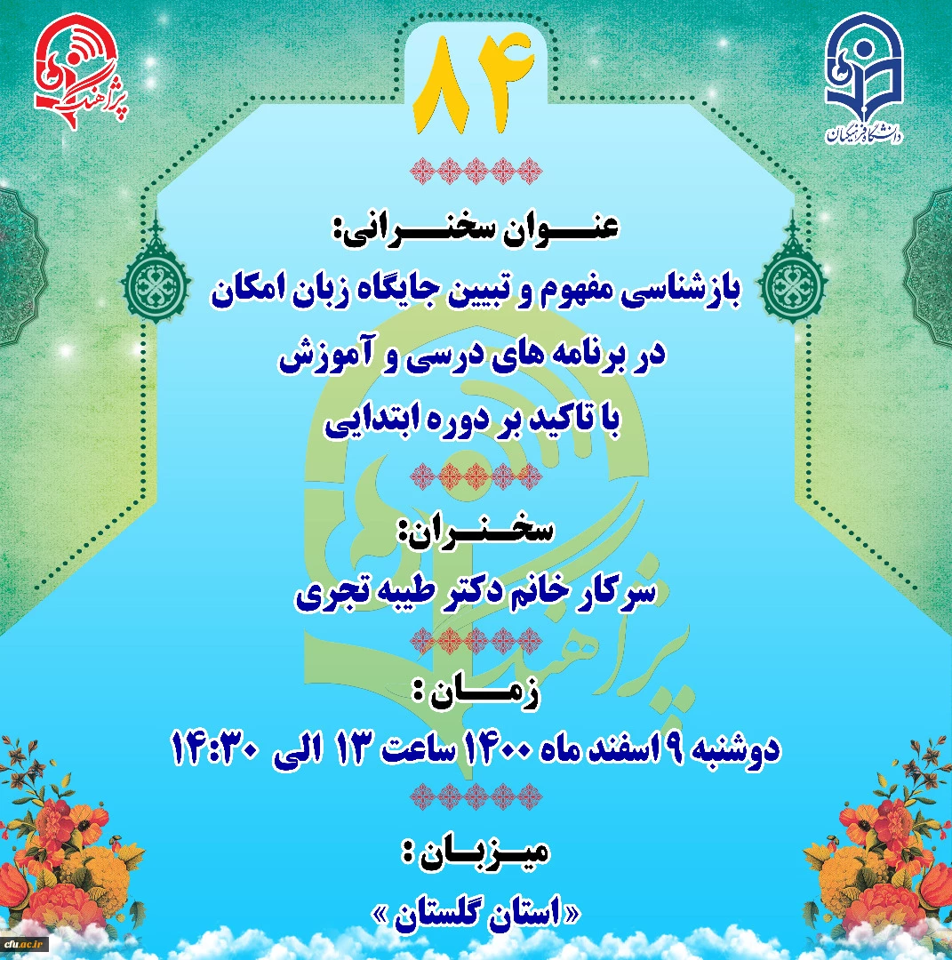 براساس اعلام حوزه معاونت پژوهش و فناوری دانشگاه فرهنگیان، در ادامه اجرای برنامه «پژآهنگ»، سخنرانی هشتاد و چهارم با عنوان «بازشناسی مفهوم تبین جایگاه امکان در برنامه های درسی اموزش تاکید بر دوره ابتدایی» با ارائه طیبه تجری از مدیریت امور پردیس های استان گستان، روز دوشنبه مورخ 1400/12/9 از ساعت 13 الی 14/30 به صورت مجازی از طریق سامایه یادگیری الکترونیکی دانشگاه فرهنگیان به آدرس elearning.cfu.ac.ir برگزار شد.