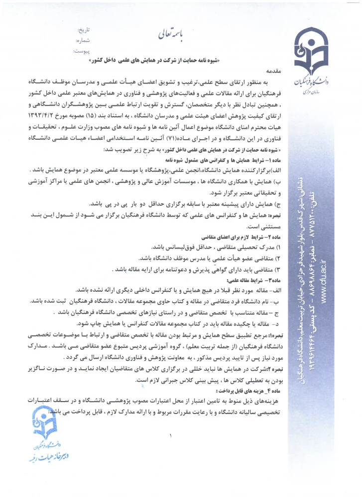شیوه نامه حمایت از شرکت مدرسان و اعضای هیئت علمی در همایش های علمی داخل کشور