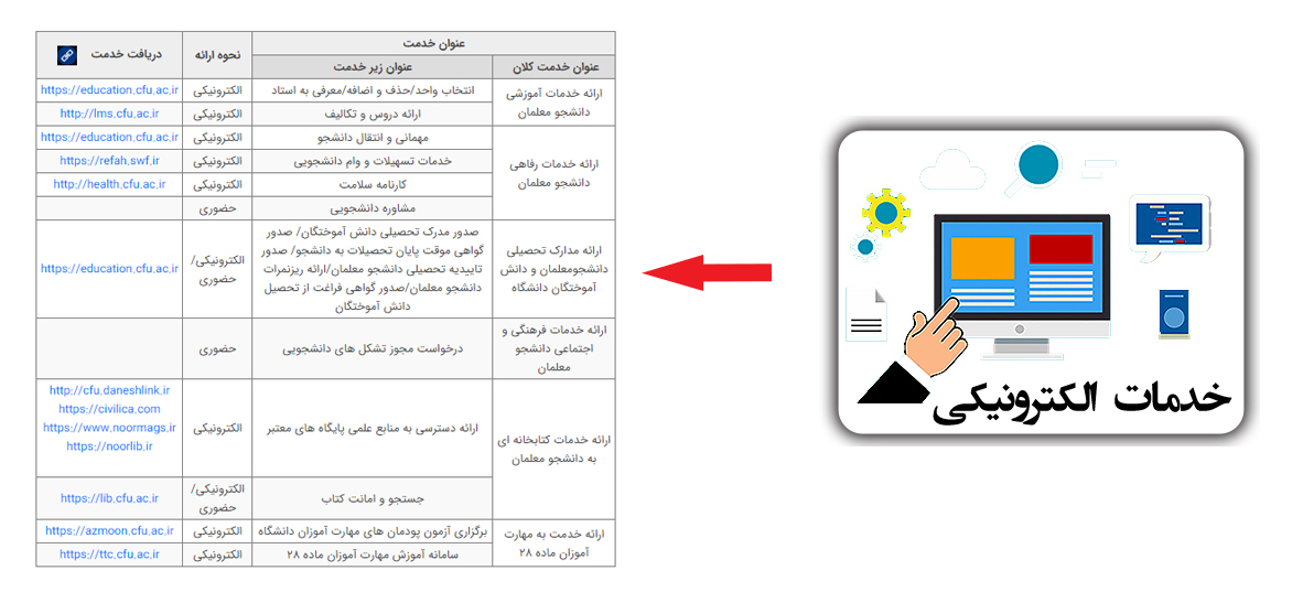 مخاطبان به منظور بهره مندی از این خدمات می توانند به فهرست بالای صفحه ی نخست پورتال دانشگاه فرهنگیان به نشانی https://cfu.ac.ir گزینه ی "میز خدمت" مراجعه نمایند.