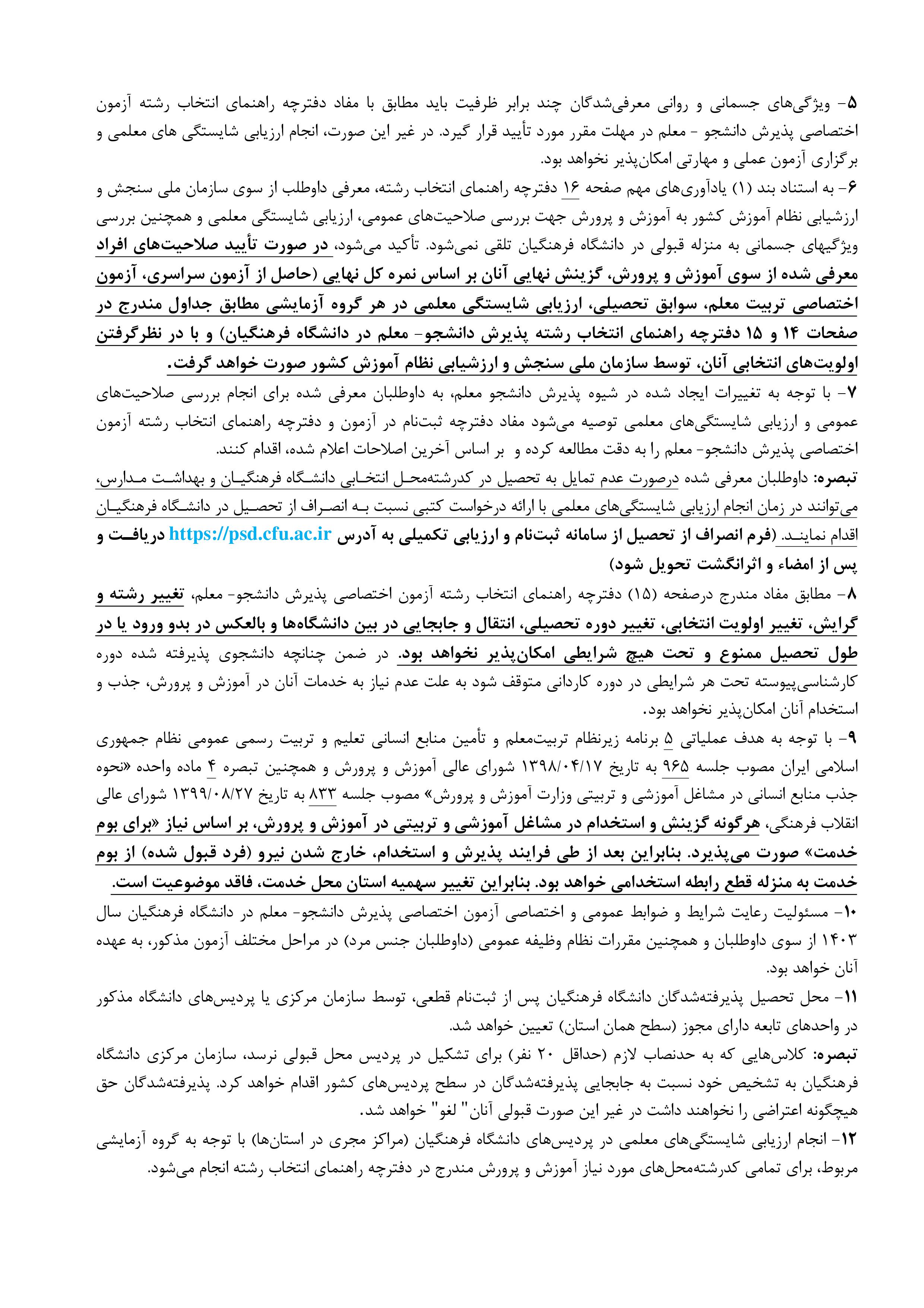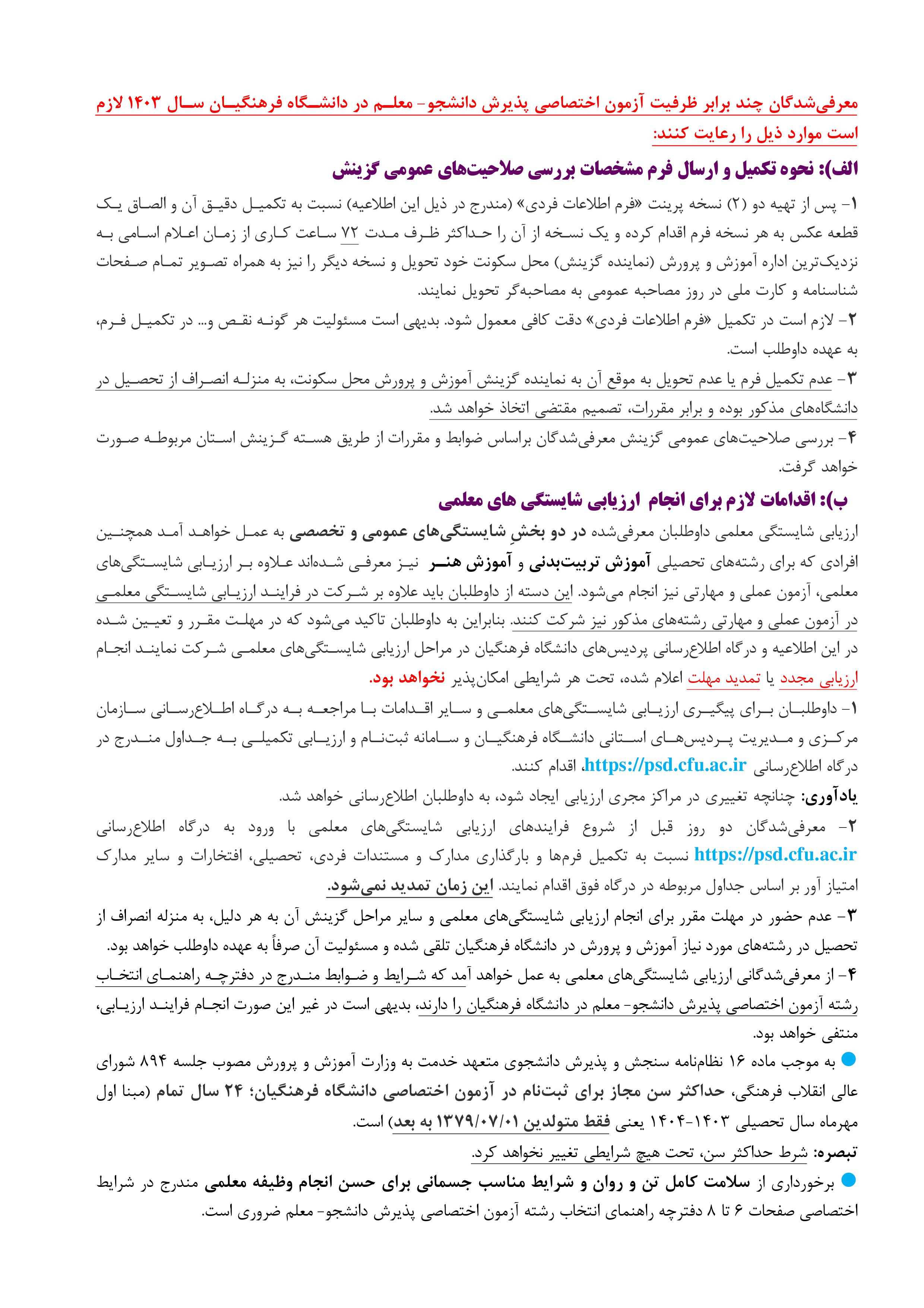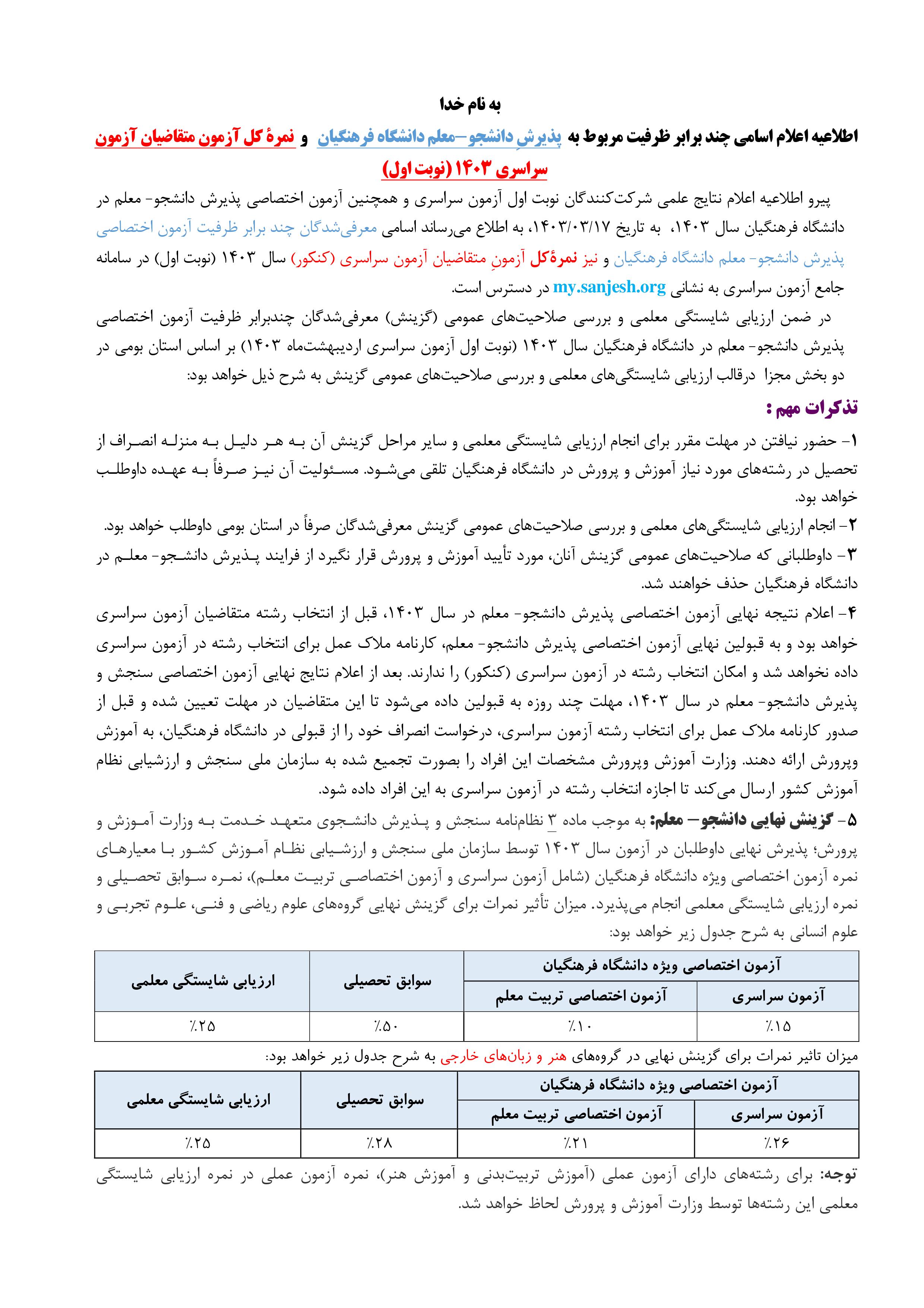 اطلاعیه اعلام اسامی چند برابر ظرفیت مربوط به پذیرشِ دانشجو-معلم دانشگاه فرهنگیان و نمرۀ کل آزمون متقاضیان آزمون سراسری 1403 (نوبت اول) 2