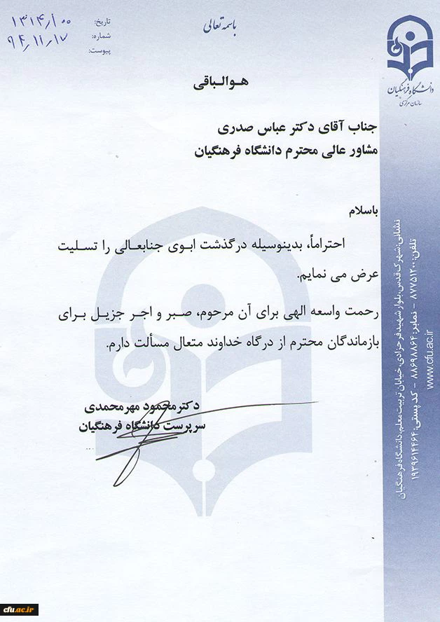 خبر مصیبت وارده، موجب تأسف و تأثر همکارانتان در سازمان مرکزی دانشگاه فرهنگیان شد، ضمن عرض تسلیت به شما و سایر بازماندگان، برای آن مرحوم، رحمت و آمرزش الهی و برای شما و بازماندگان، صبر، بردباری و طول عمر همراه با عزت و سربلندی از درگاه خداوند سبحان مسألت داریم.