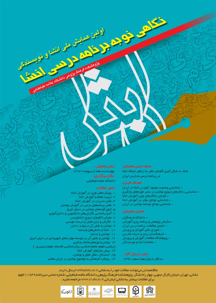 پژوهشکده ی فرهنگ پژوهی دانشگاه علامه طباطبایی(ره) با همکاری دانشگاه فرهنگیان، چهارشنبه،10/2/93، اقدام به برگزاری "اولین همایش ملی انشا و نویسندگی" با هدف کمک به شکل گیری گفتمان ناظر بر ارتقاء جایگاه انشا در برنامه درسی مدارس ایران، در  دانشگاه علامه طباطبایی(ره) خواهد نمود .