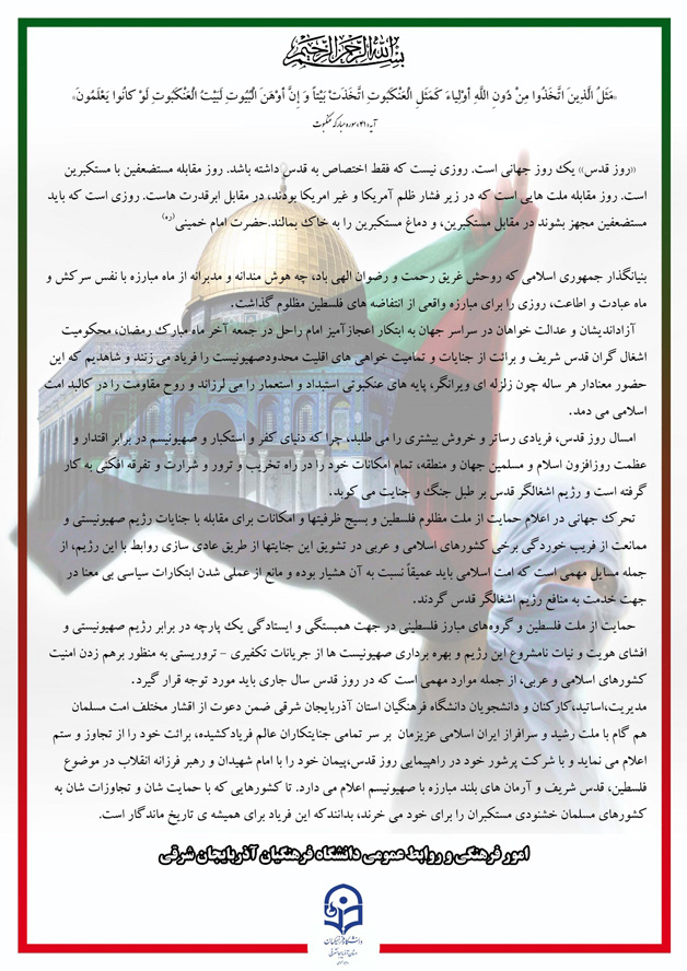در آخرین جمعه ماه مبارک رمضان مدیریت، اساتید، کارکنان و جمعی از دانشجو معلمان دانشگاه فرهنگیان آذربایجان شرقی نیز همگام با امت همیشه در صحنه ایران اسلامی بار دیگر با حضور پر شور خود در راهپیمایی عظیم روز جهانی قدس ندای مظلومیت مردم رنج دیده فلسطین را فریاد زده و خشم خود را از جنایات رژیم اشغالگر قدس ابراز کردند.