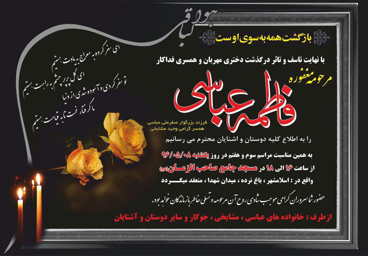 شایان ذکر است مجلس ترحیمی به همین مناسبت یکشنبه ساعت 16الی18واقع در اسلامشهر ،شهرک ایرانشهر،نبش میدان،مسجد صاحب الزمان(عج) برگزار خواهد شد.