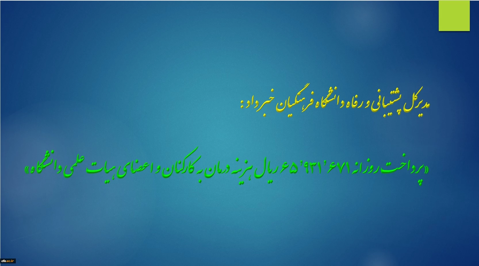 مدیرکل پشتیبانی و رفاه دانشگاه فرهنگیان خبر داد : پرداخت روزانه 65,931,671 ریال هزینه درمان به کارکنان و اعضای هیات علمی دانشگاه 2