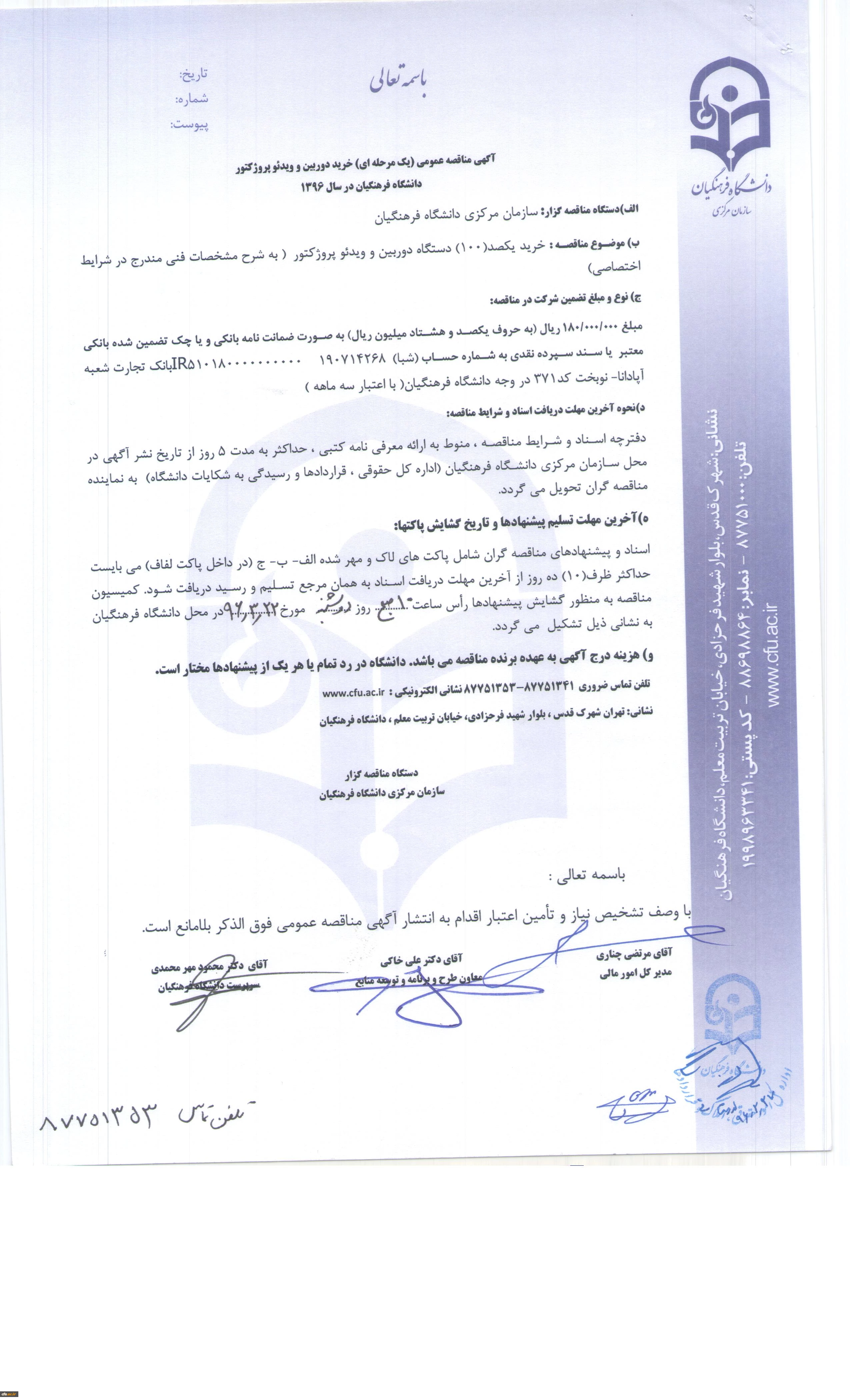 آگهی مناقصه عمومی(یک مرحله ای)خرید دوربین و ویدئو پروژوکتور در سال 1396 2