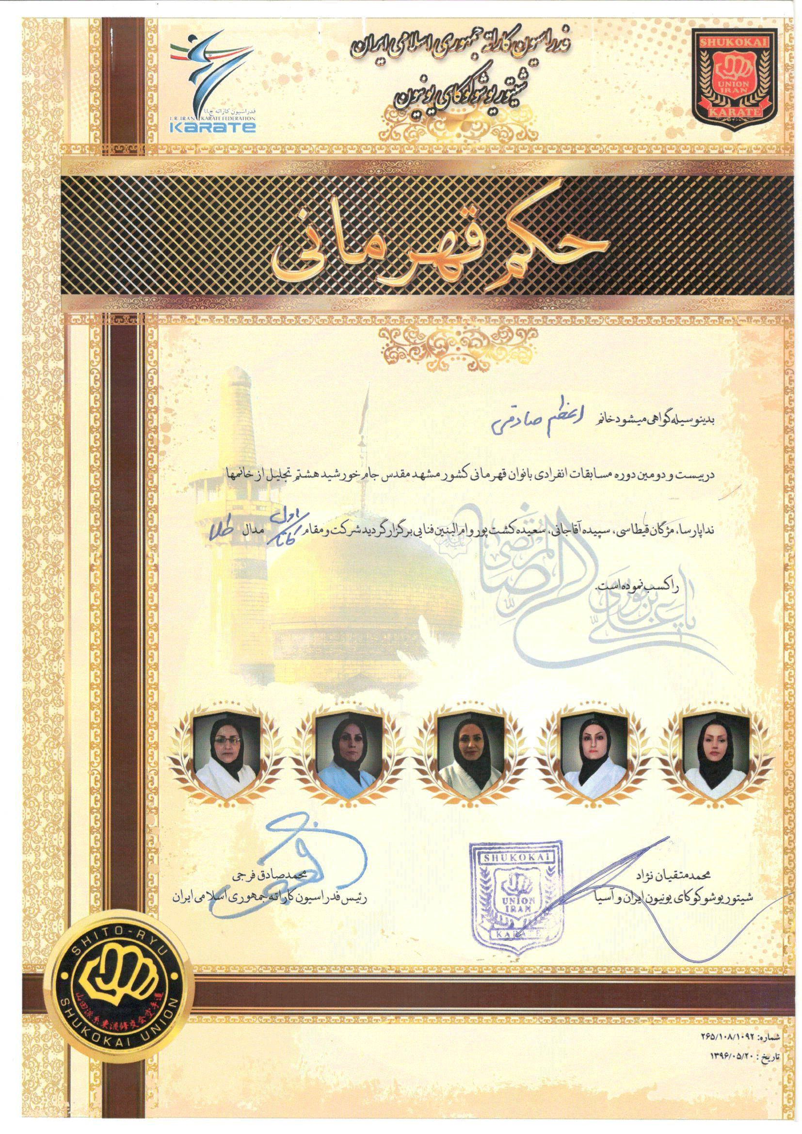 کسب مقام اول قهرمانی در رشته کاتا،در بیست و دومین مسابقات انفرادی بانوان قهرمانی 2