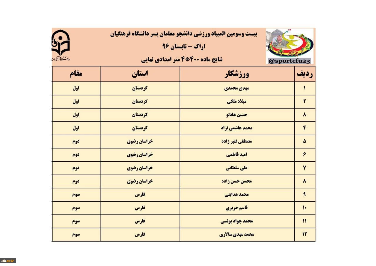 نتایج سه رشته ی دو و میدانی، کشتی و تکواندو در رقابت های المپیاد ورزشی دانشجو معلمان پسر 18