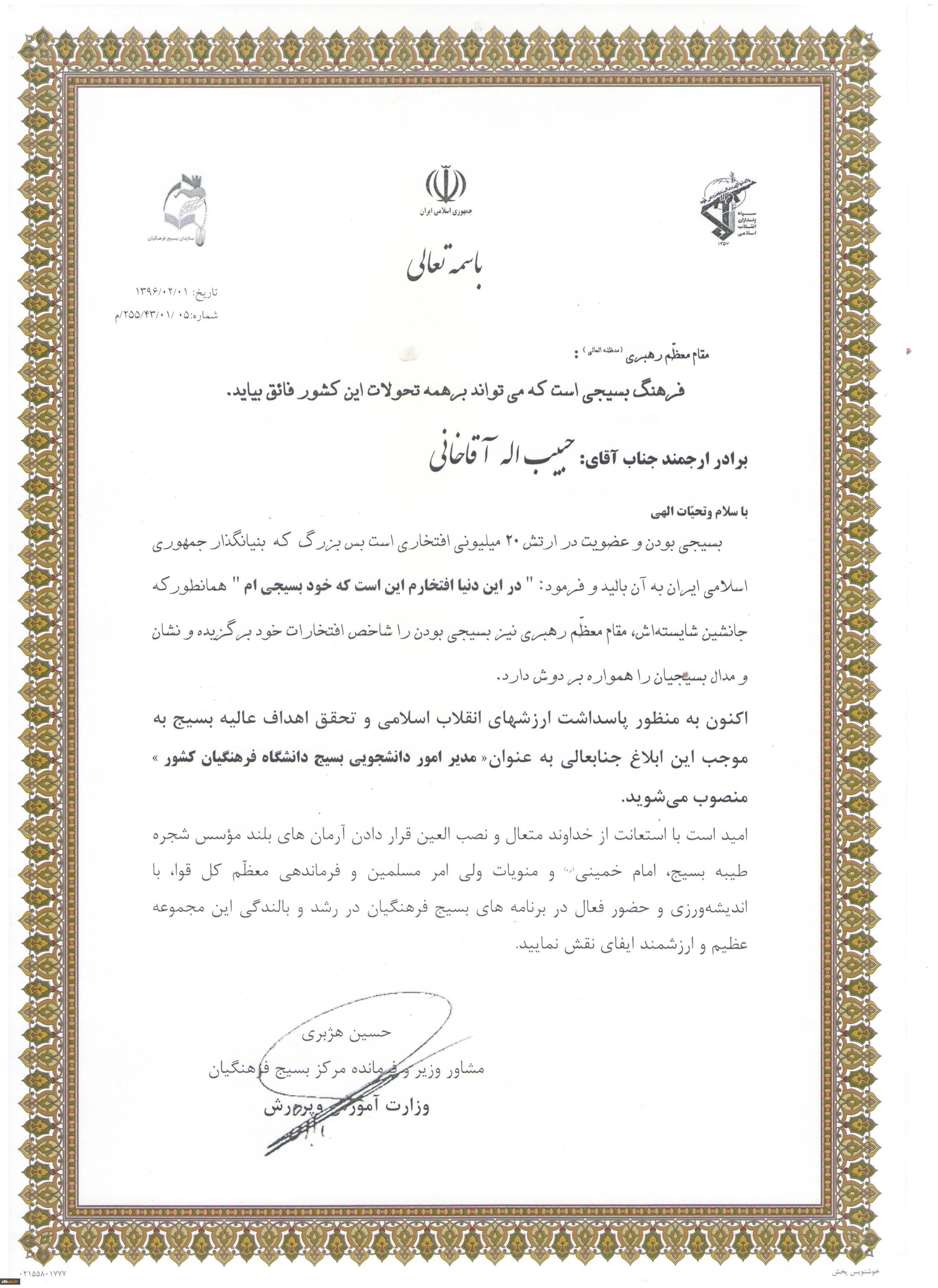 حکم انتصاب جناب آقای حبیب اله آقاخانی به سمت "مدیر امور دانشجویی بسیج دانشگاه فرهنگیان کشور"