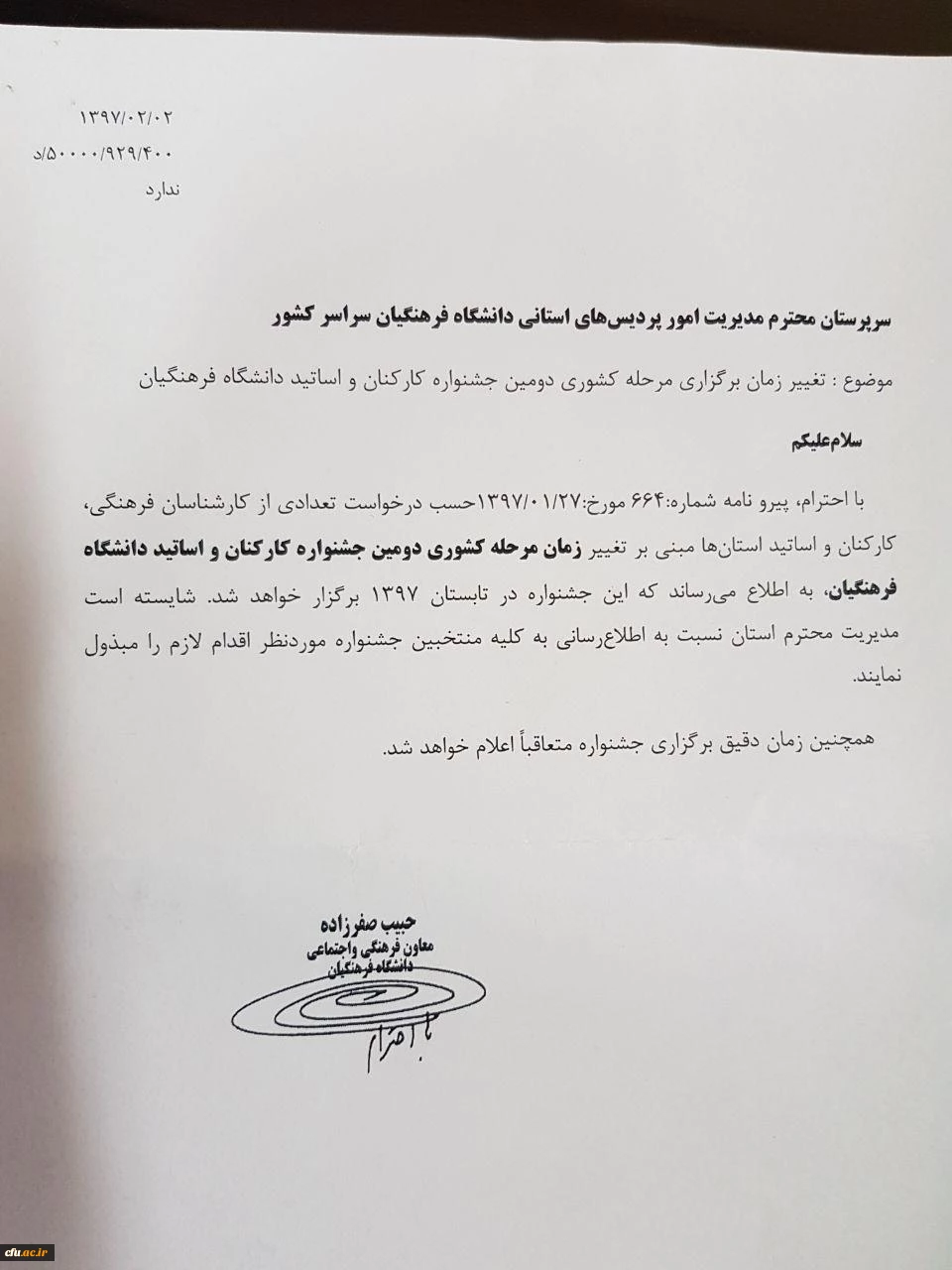 تغییر زمان برگزاری مرحله کشوری دومین جشنواره کارکنان و اساتید دانشگاه فرهنگیان 2