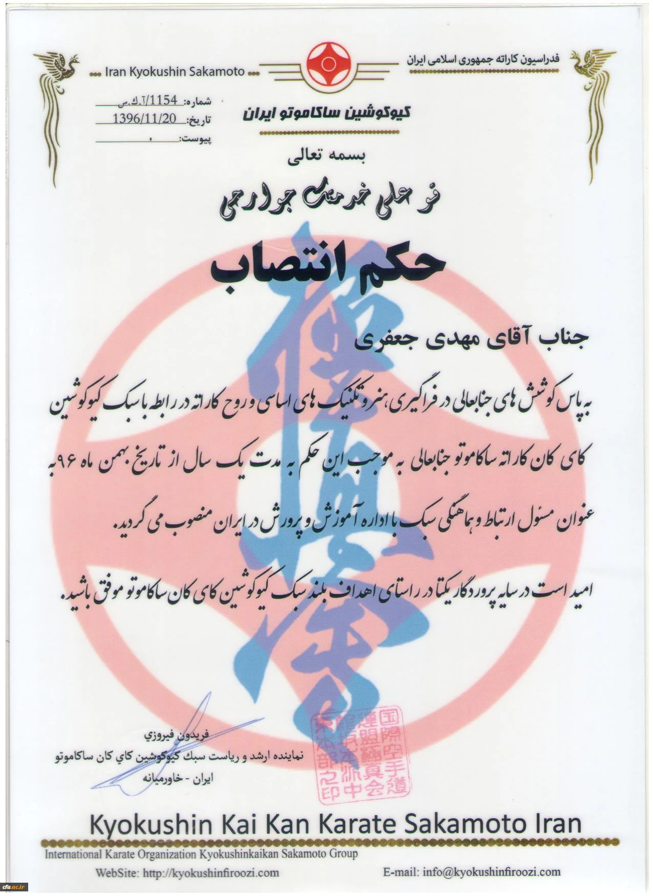 انتصاب مهدی جعفری به عنوان مسئول ارتباط و هماهنگی سبک کاراته با اداره آموزش و پرورش در ایران 2