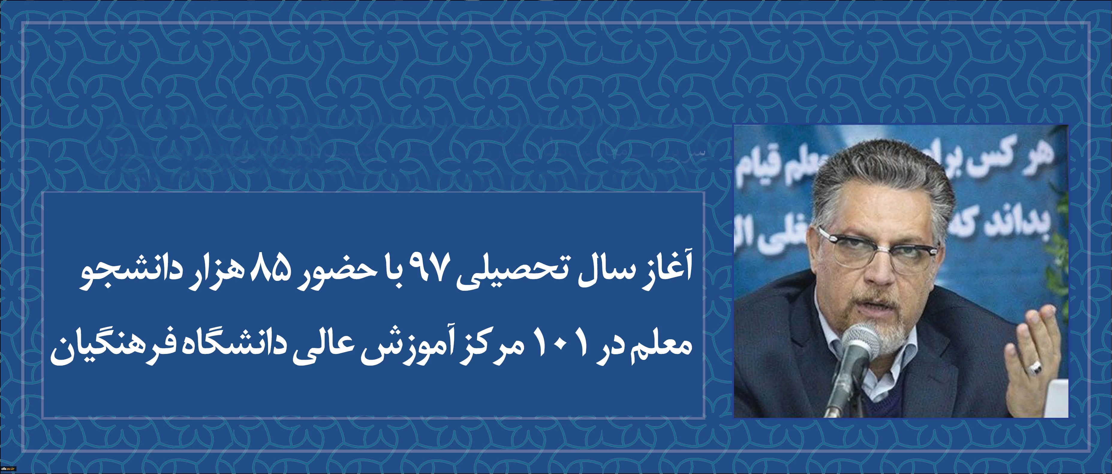 سرپرست معاونت نظارت ارزیابی و تضمین کیفیت دانشگاه فرهنگیان خبر داد: آغاز سال تحصیلی 97 با حضور 85 هزار دانشجو معلم در 101 مرکز آموزش عالی دانشگاه فرهنگیان 2