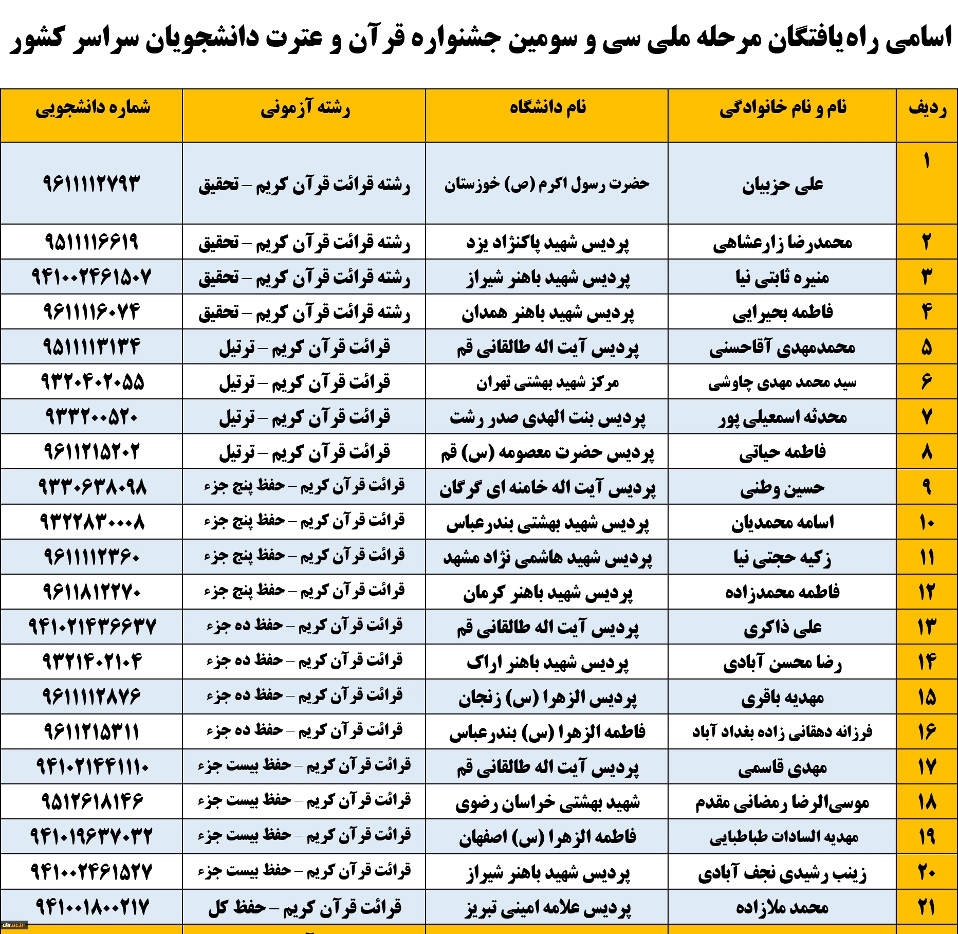 اسامی راه یافتگان مرحله ملی سی وسومین جشنواره قرآن و عترت دانشجویان سراسر کشور