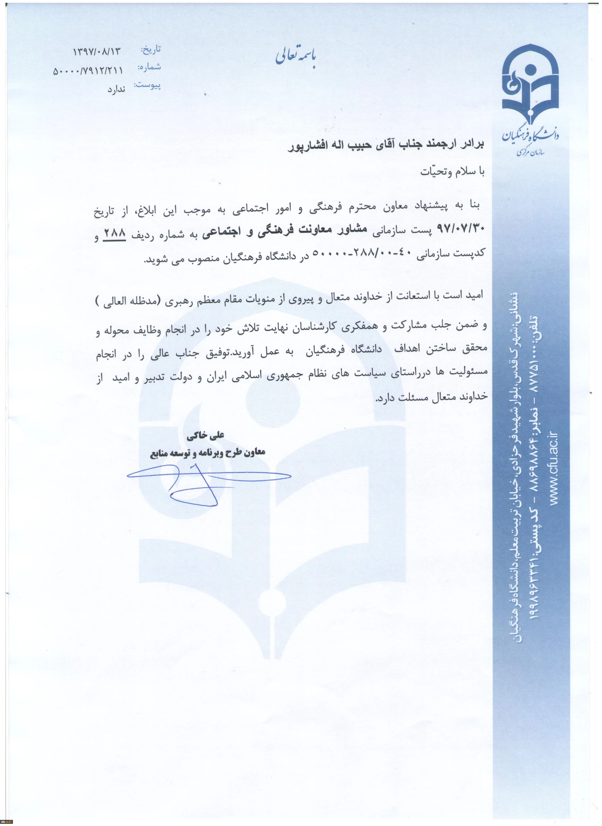 انتصاب حبیب اله افشار پور به سمت مشاور معاونت فرهنگی و اجتماعی 2