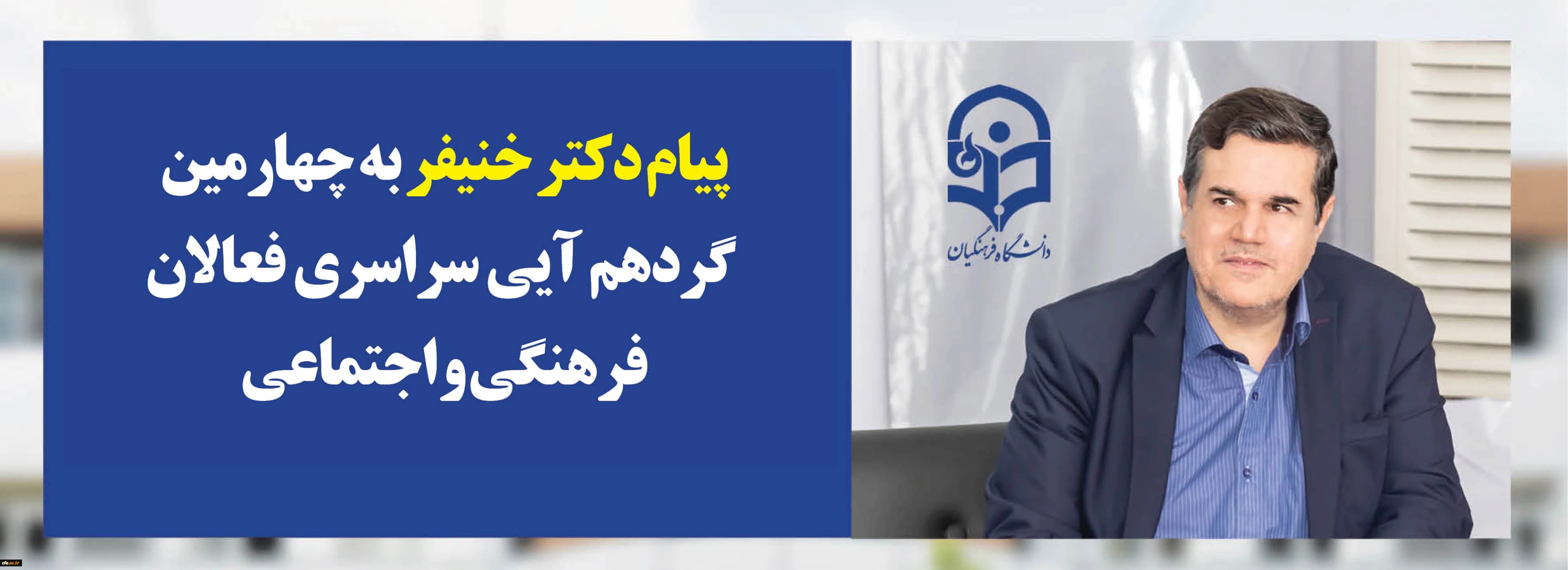 پیام دکتر خنیفر رییس دانشگاه فرهنگیان به چهارمین گردهمآیی سراسری فعالان فرهنگی و اجتماعی: رویش فرصتی برای بهره گیری دانشجومعلمان از تجارب یکدیگر ، ظرفیت فاخراساتید و اندوخته های ارزشمند کارشناسان فرهنگی 2