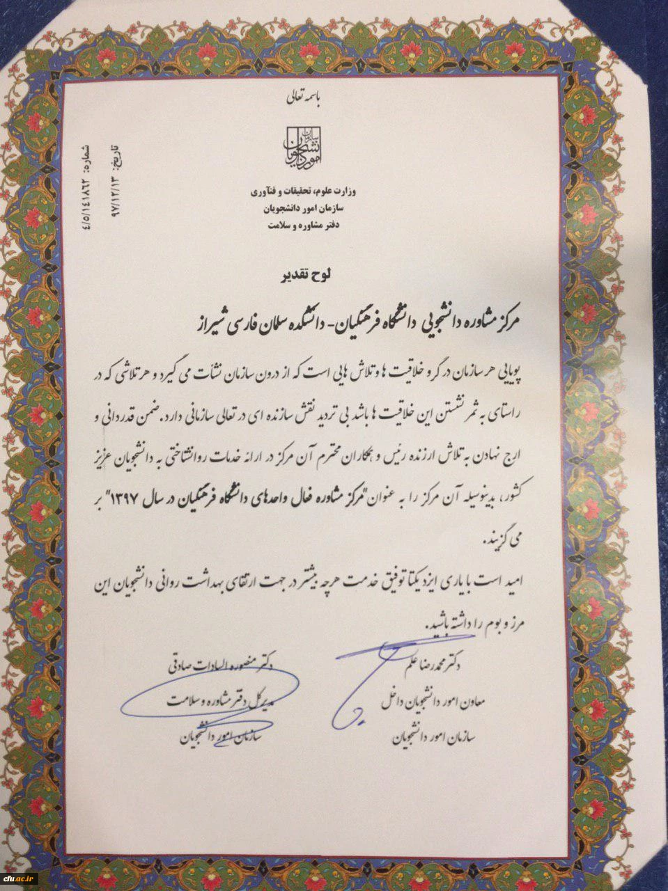 مرکز مشاوره دانشجویی واحد آموزش عالی سلمان فارسی استان فارس در سی امین گردهمایی روسای مراکز مشاوره دانشجویی دانشگاه های سراسر کشور کسب کرد: عنوان مرکز مشاوره فعال سال 97 در بین دانشگاه های وزارت علوم، تحقیقات و فناوری 2