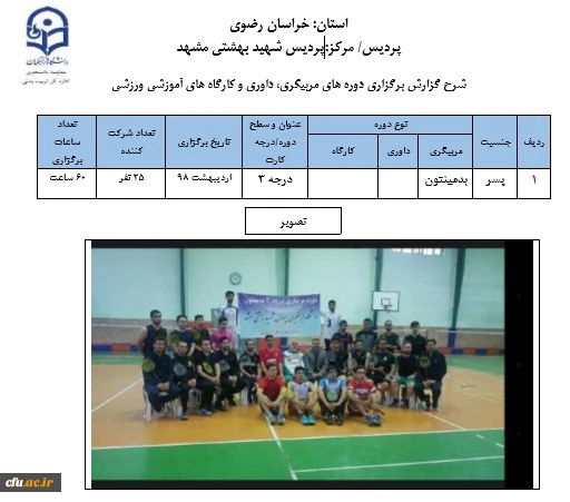 گزارش برگزاری دوره های مربیگری، داوری و کارگاه های آموزشی ورزشی پردیس شهید بهشتی استان خراسان رضوی 2