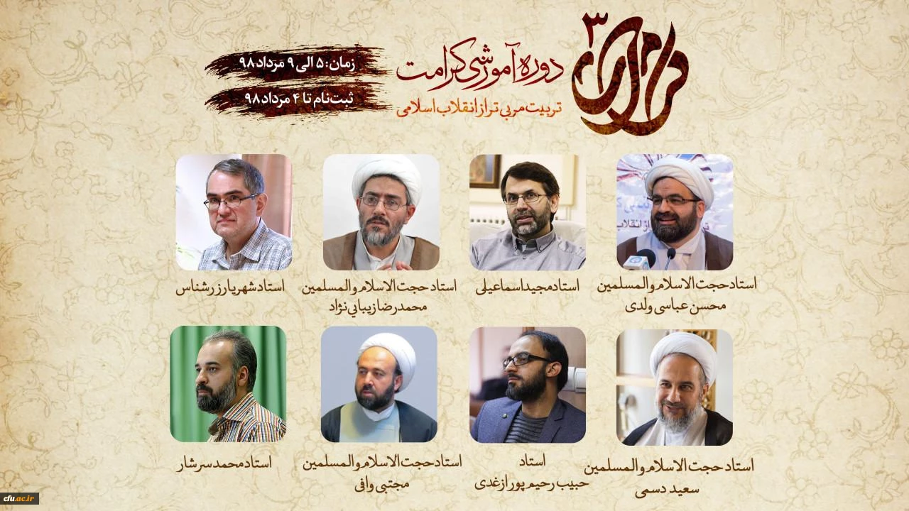 با همکاری دفتر نهاد نمایندگی مقام معظم رهبری در سازمان مرکزی دانشگاه فرهنگیان برگزار می شود: آغاز ثبت نام دوره آموزشی کرامت 3 ( تربیت مربی تراز انقلاب اسلامی) 2