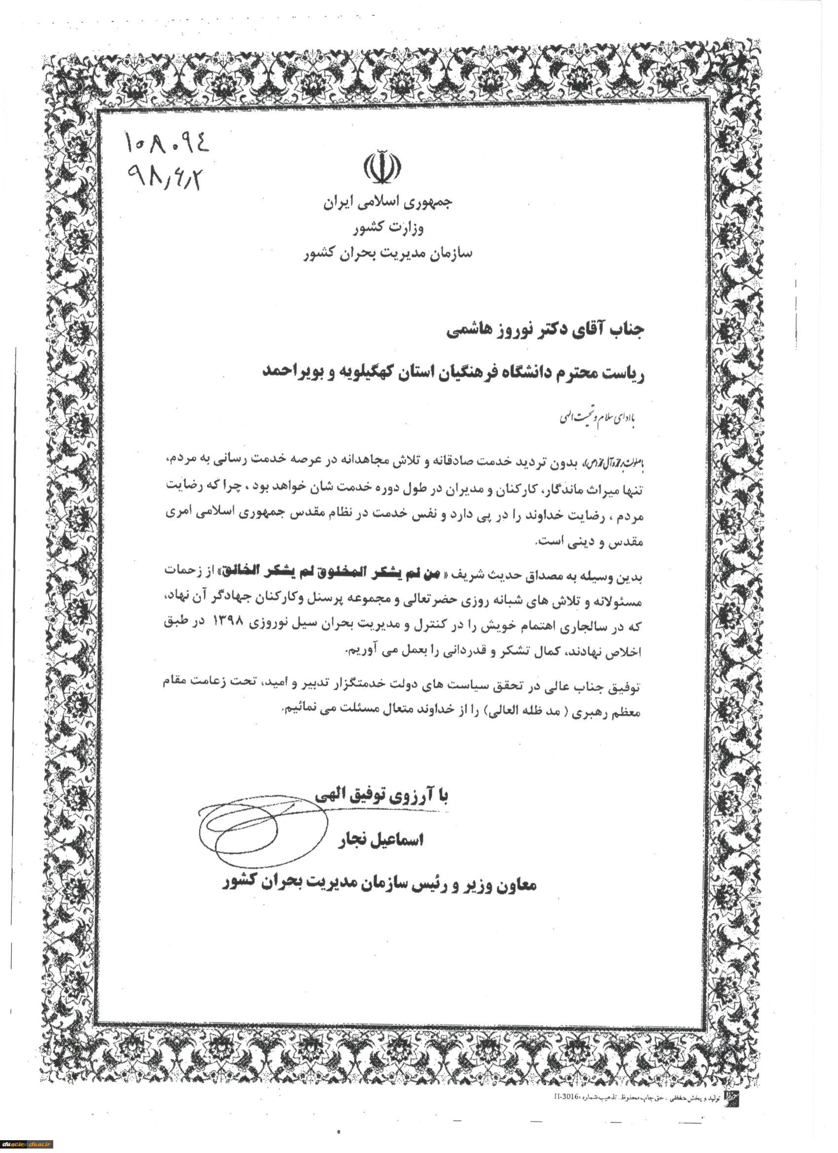 تقدیر معاون وزیر و رئیس سازمان مدیریت بحران کشور از رئیس دانشگاه فرهنگیان کهگیلویه و بویراحمد 2