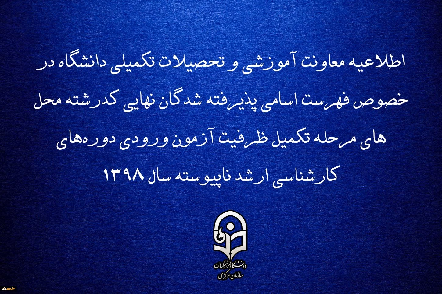 اطلاعیه معاونت آموزشی و تحصیلات تکمیلی دانشگاه در خصوص فهرست اسامی پذیرفته شدگان نهایی کدرشته محل های مرحله تکمیل ظرفیت آزمون ورودی دوره های کارشناسی ارشد ناپیوسته سال 1398 2