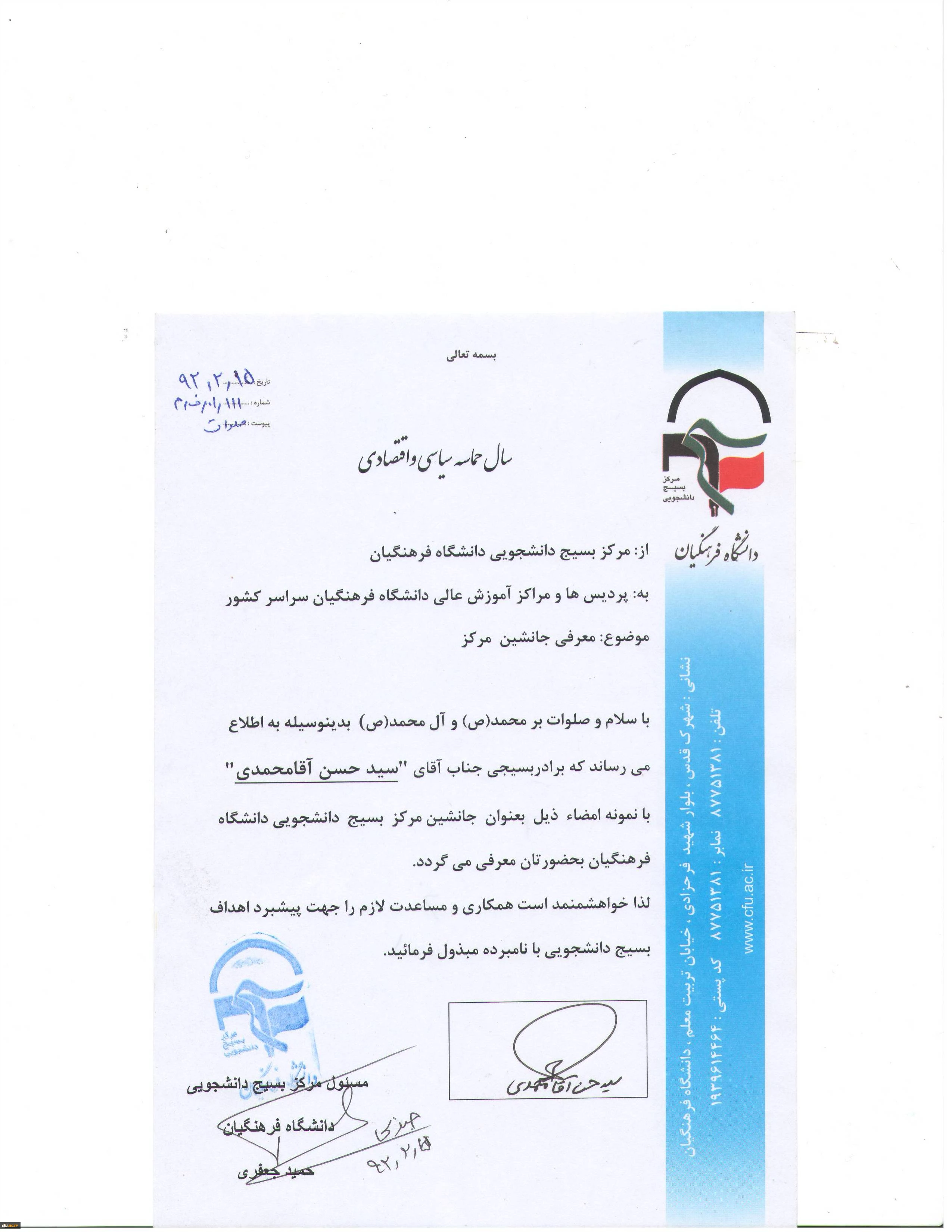 معرفی جانشین مرکز بسیج دانشجویی