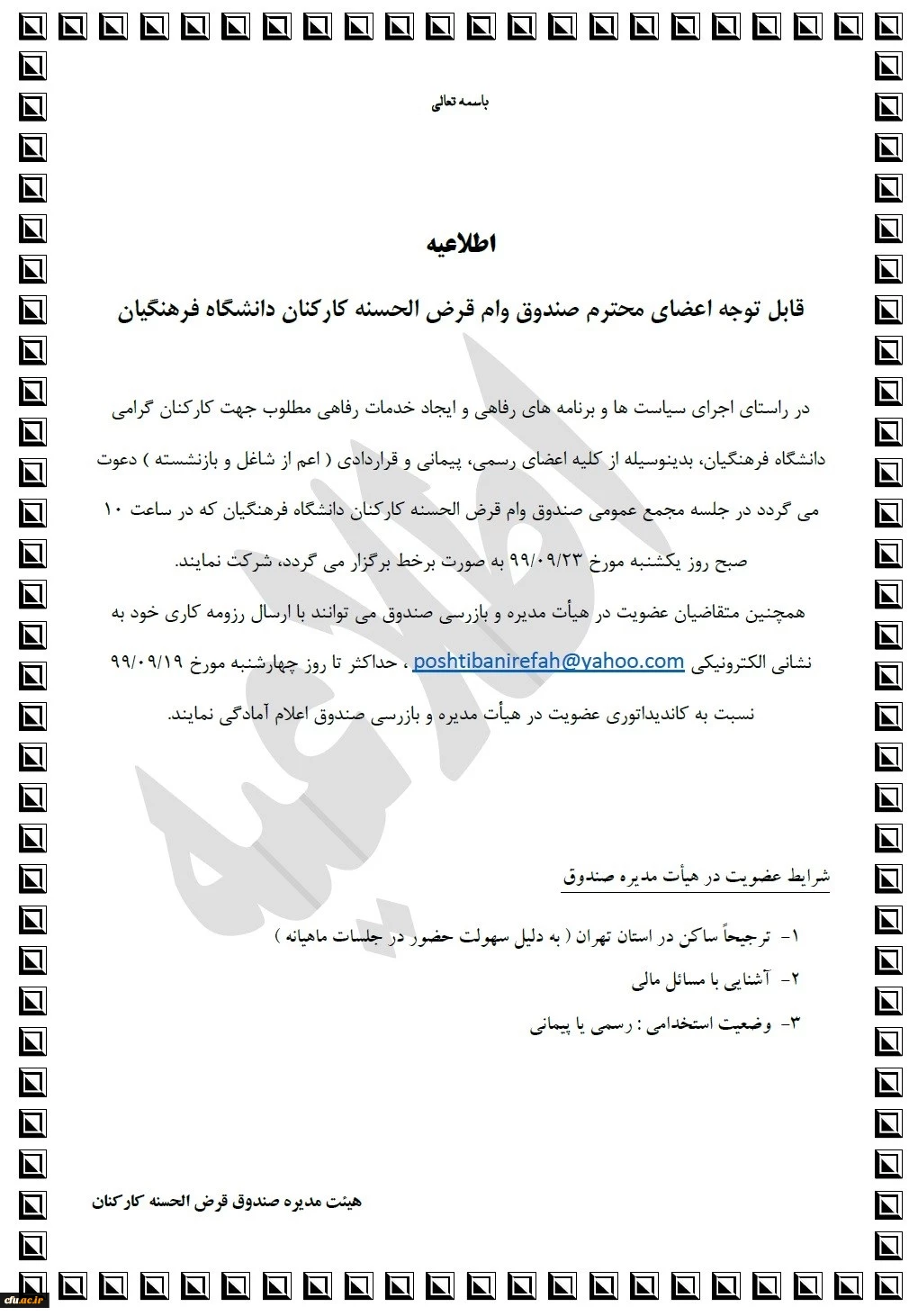 اطلاعیه مجمع عمومی صندوق قرض الحسنه کارکنان دانشگاه فرهنگیان 2