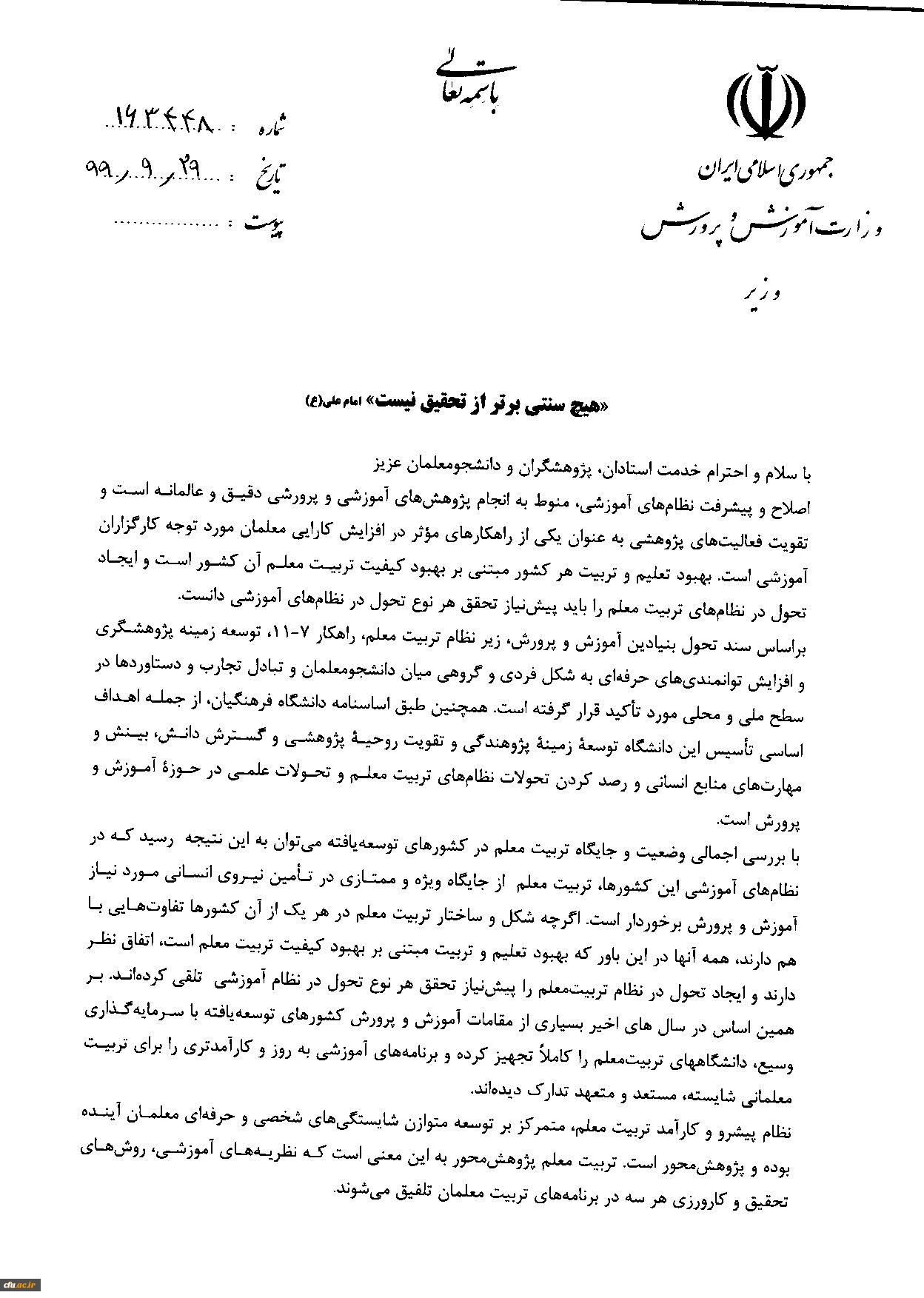پیام وزیر آموزش و پرورش به نهمین جشنواره ملی پژوهش و فناوری دانشگاه فرهنگیان 2