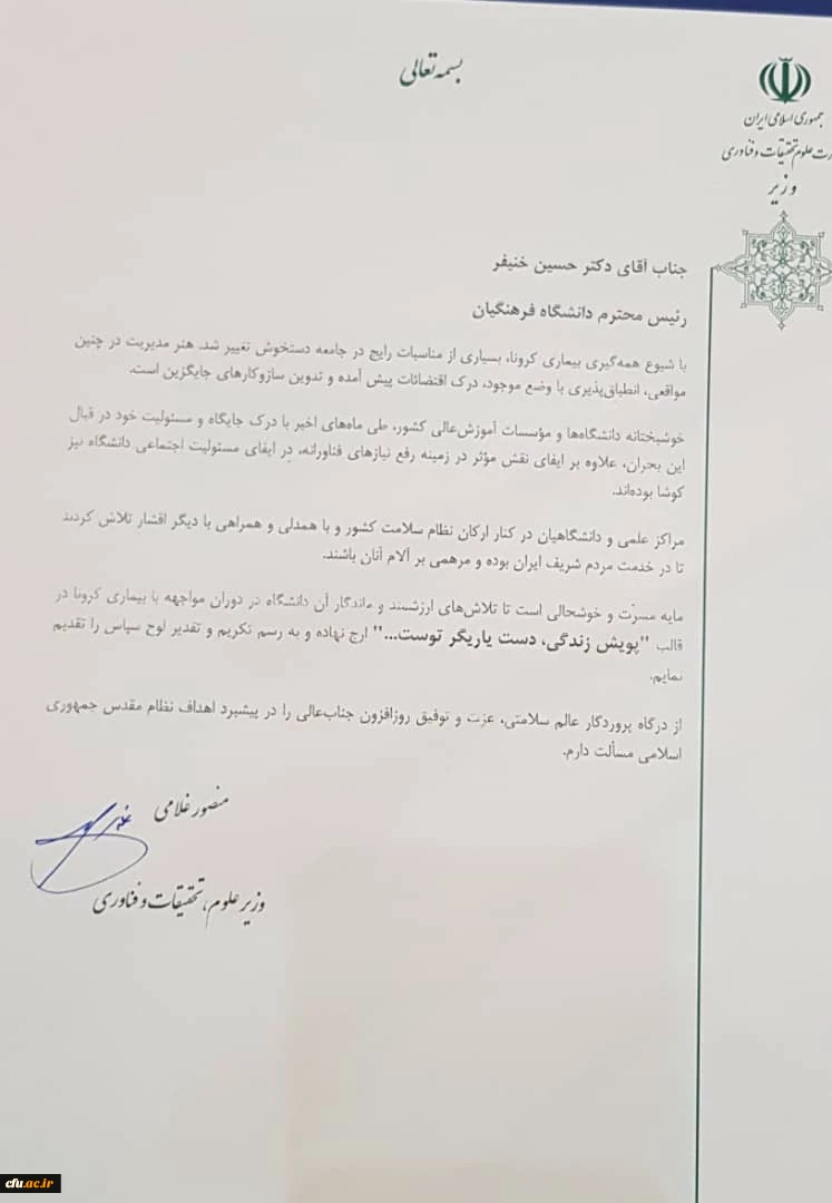 تقدیر وزیر علوم تحقیقات و فناوری از اقدامات فرهنگی و اجتماعی دانشگاه فرهنگیان در دوران مواجهه با کرونا 3