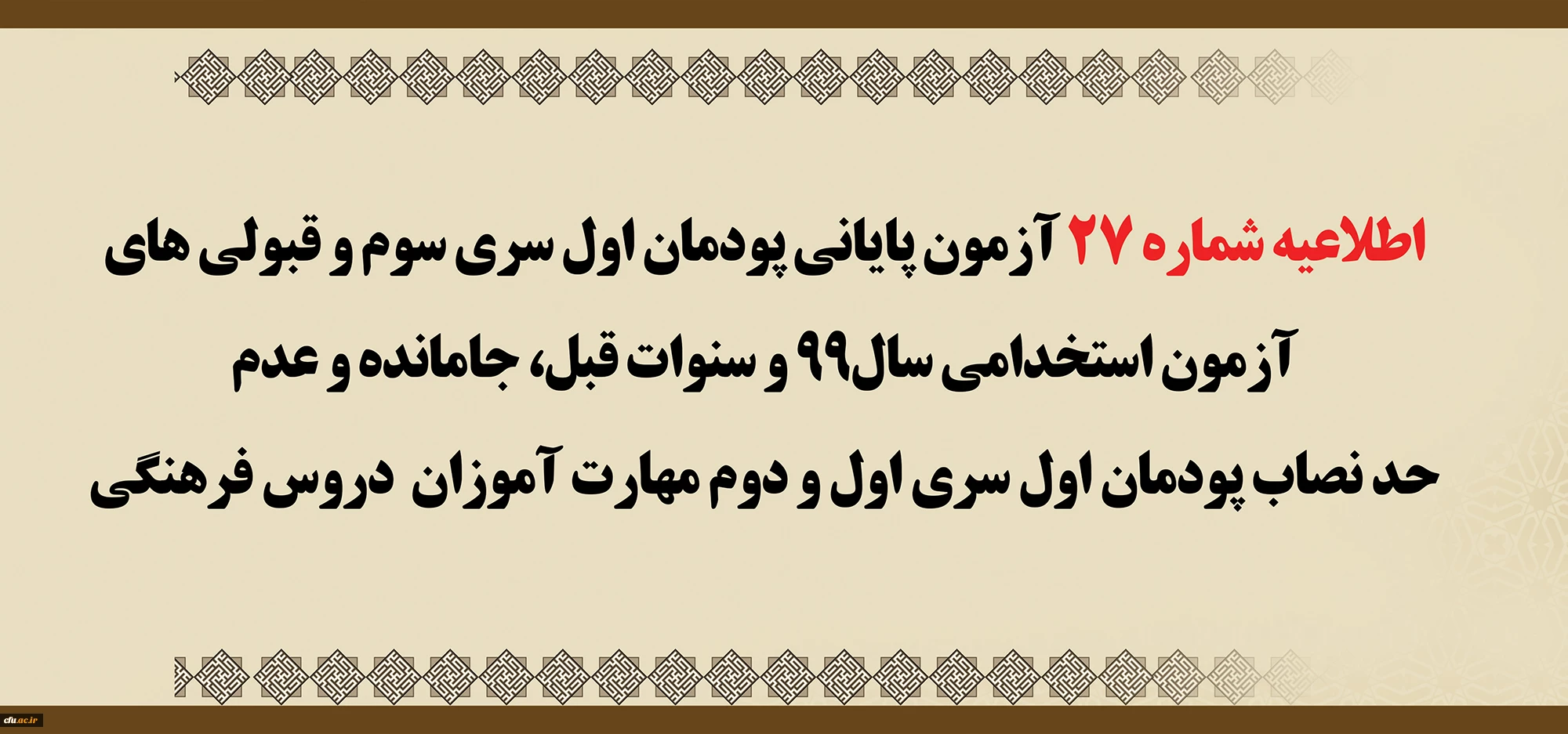 اطلاعیه شماره 27 آزمون پایانی پودمان اول سری سوم و قبولی های آزمون استخدامی سال99 و سنوات قبل، جامانده و عدم حد نصاب پودمان اول سری اول و دوم مهارت آموزان دروس فرهنگی 2