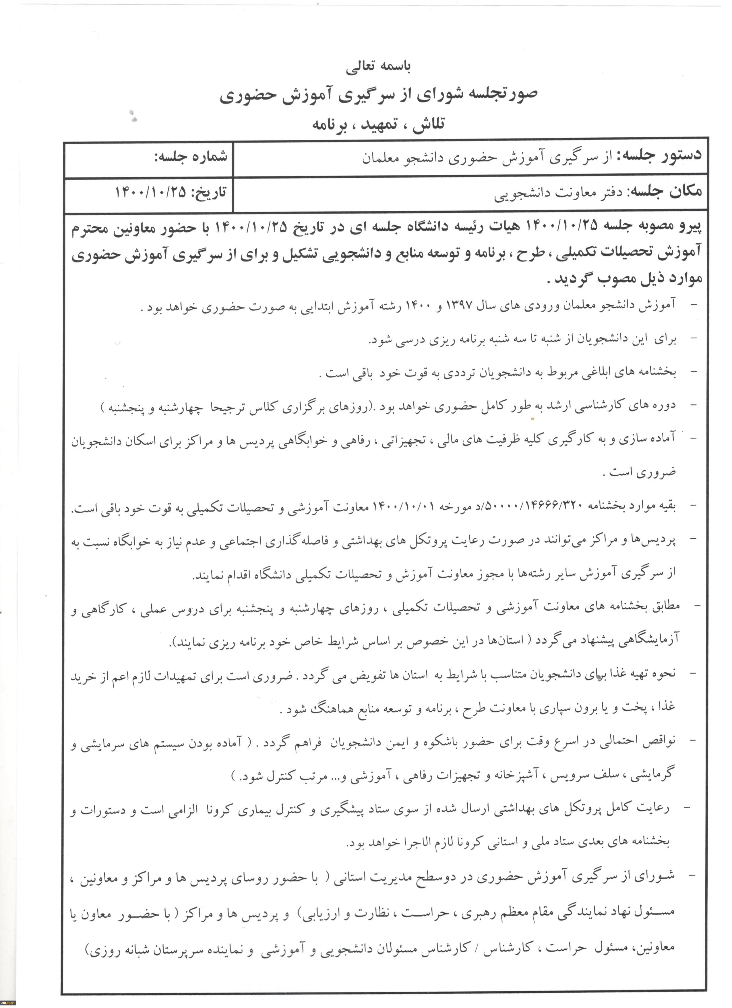 صورتجلسه از سر گیری آموزش مصوبه هیات رئیسه دانشگاه