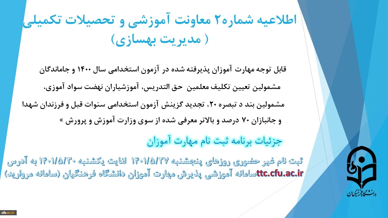 زمان بندی ثبت نام غیر حضوری و حضوری از مهارت آموزان پذیرفته شده در آزمون استخدامی سال 1400 و سایر جاماندگان اعلام شد 3