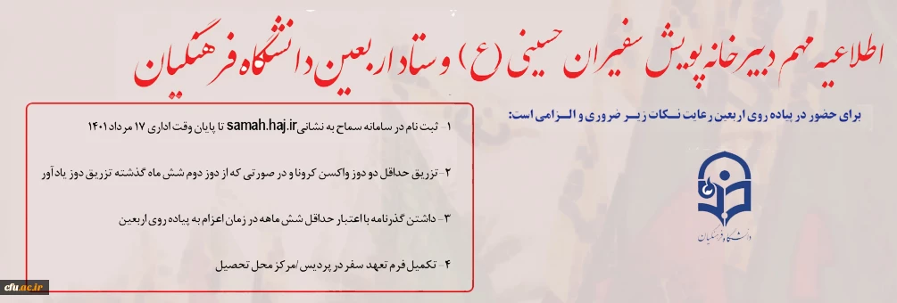اطلاعیه شماره 1 دبیرخانه سومین پویش سفیران حسینی (ع) و ستاد اربعین دانشگاه فرهنگیان 2