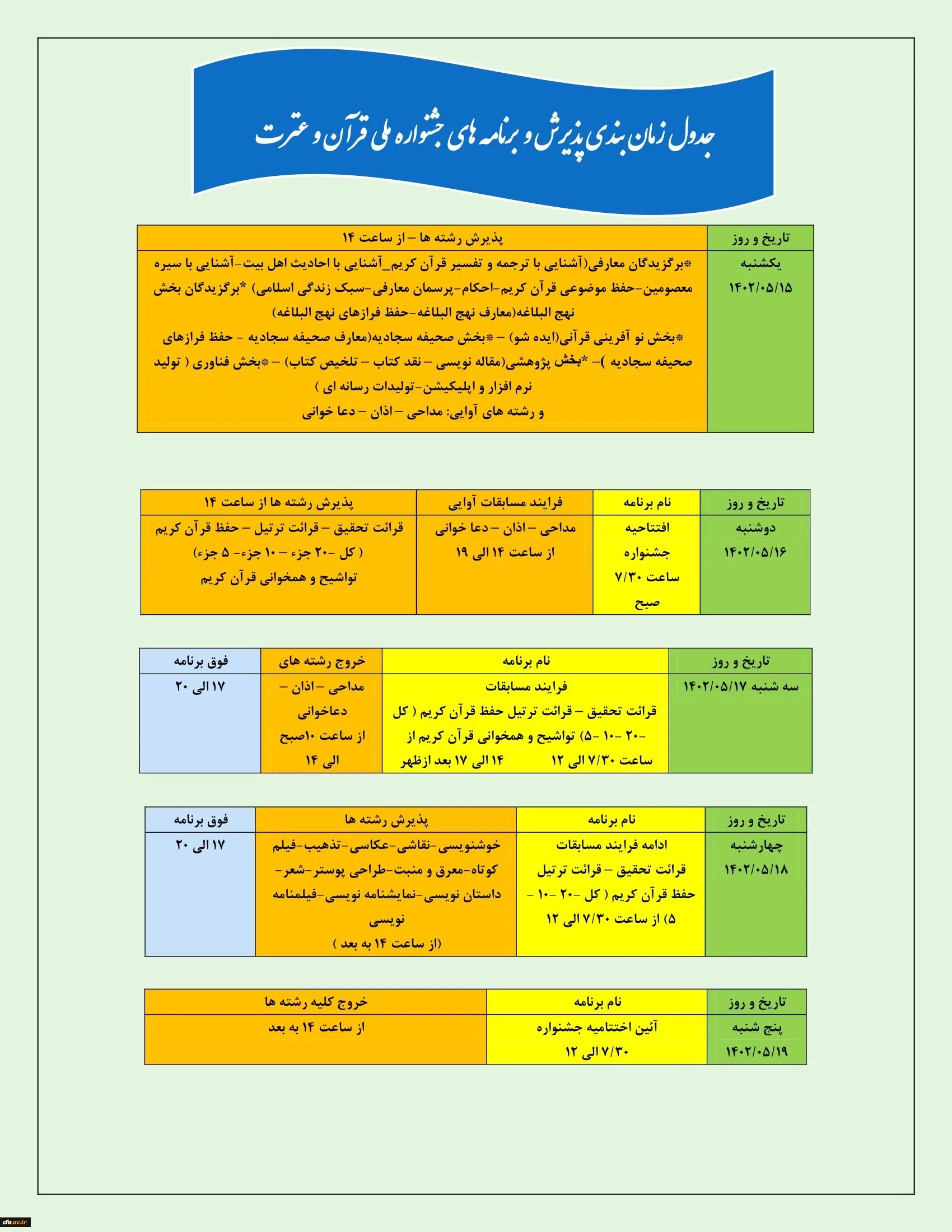 جدول زمانبندی پذیرش و برنامه های جشنواره ملی قرآن و عترت 2