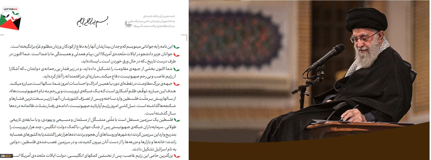 نامه حضرت آیت الله خامنه ای به دانشجویان حامی مردم فلسطین در دانشگاه های ایالات متحده آمریکا 2