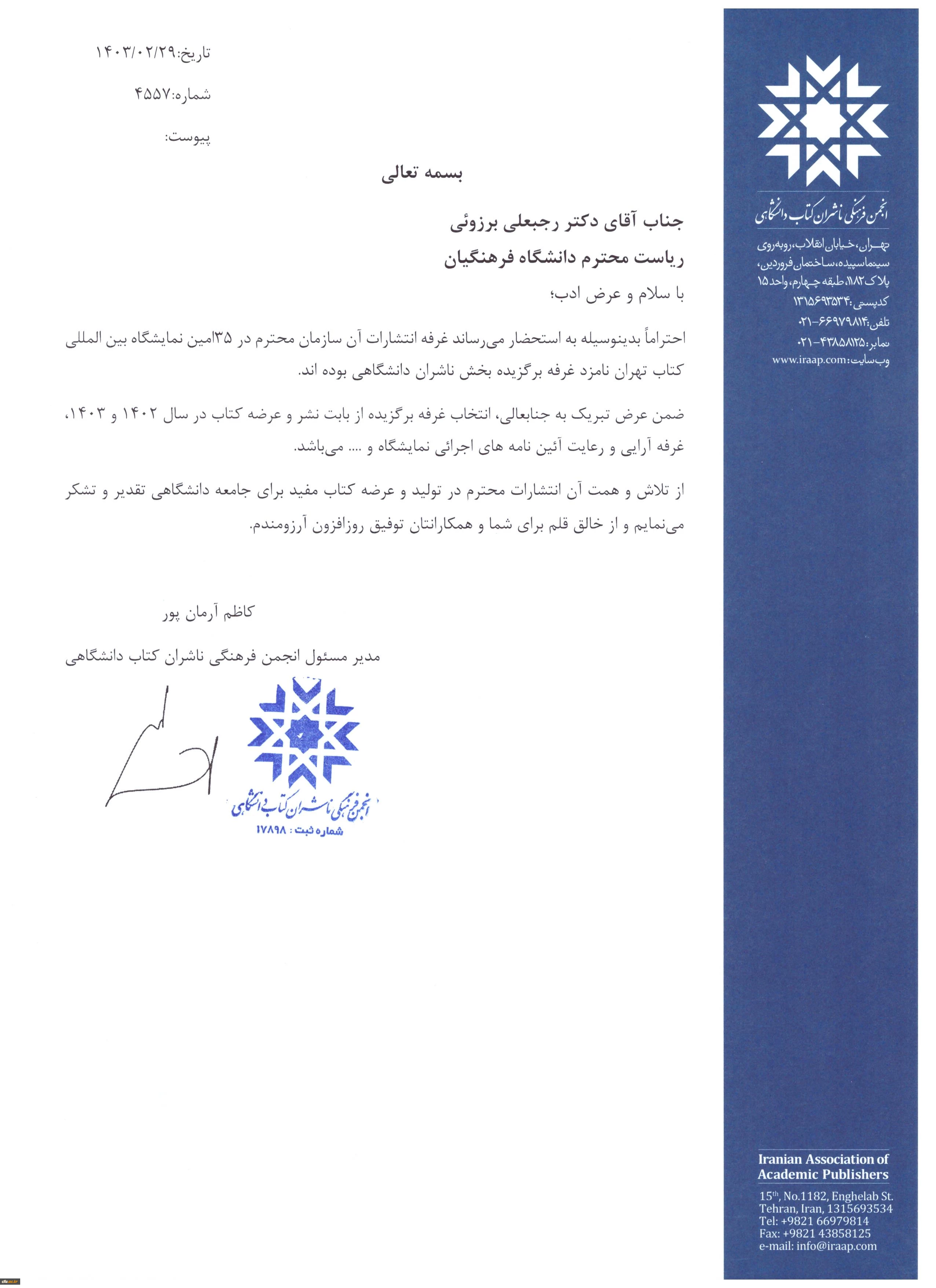 انتشارات دانشگاه فرهنگیان در فهرست نامزدان اصلی «ناشر برگزیده» دانشگاهی در سی و پنجمین نمایشگاه بین المللی کتاب تهران 2
