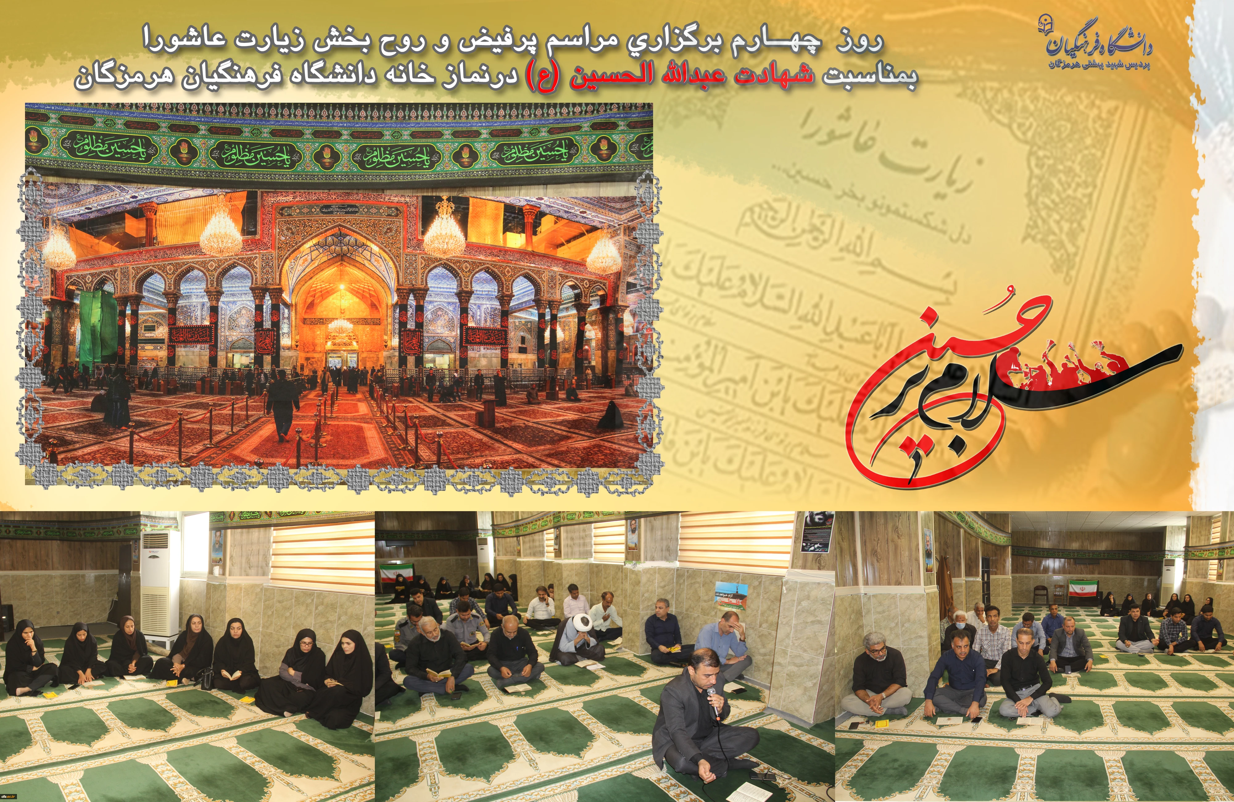 السَّلامُ عَلَى الْحُسَیْنِ وَ عَلى عَلِىِّ بْنِ الْحُسَیْنِ وَ عَلى اَوْلادِ الْحُسَیْنِ وَ عَلى اَصْحابِ الْحُسَیْنِ روز چهــارم برگزاری مراسم پرفیض و روح بخش زیارت عاشورا بمناسبت شهادت عبدالله الحسین (ع) در نماز خانه دانشگاه فرهنگیان هرمزگان 2