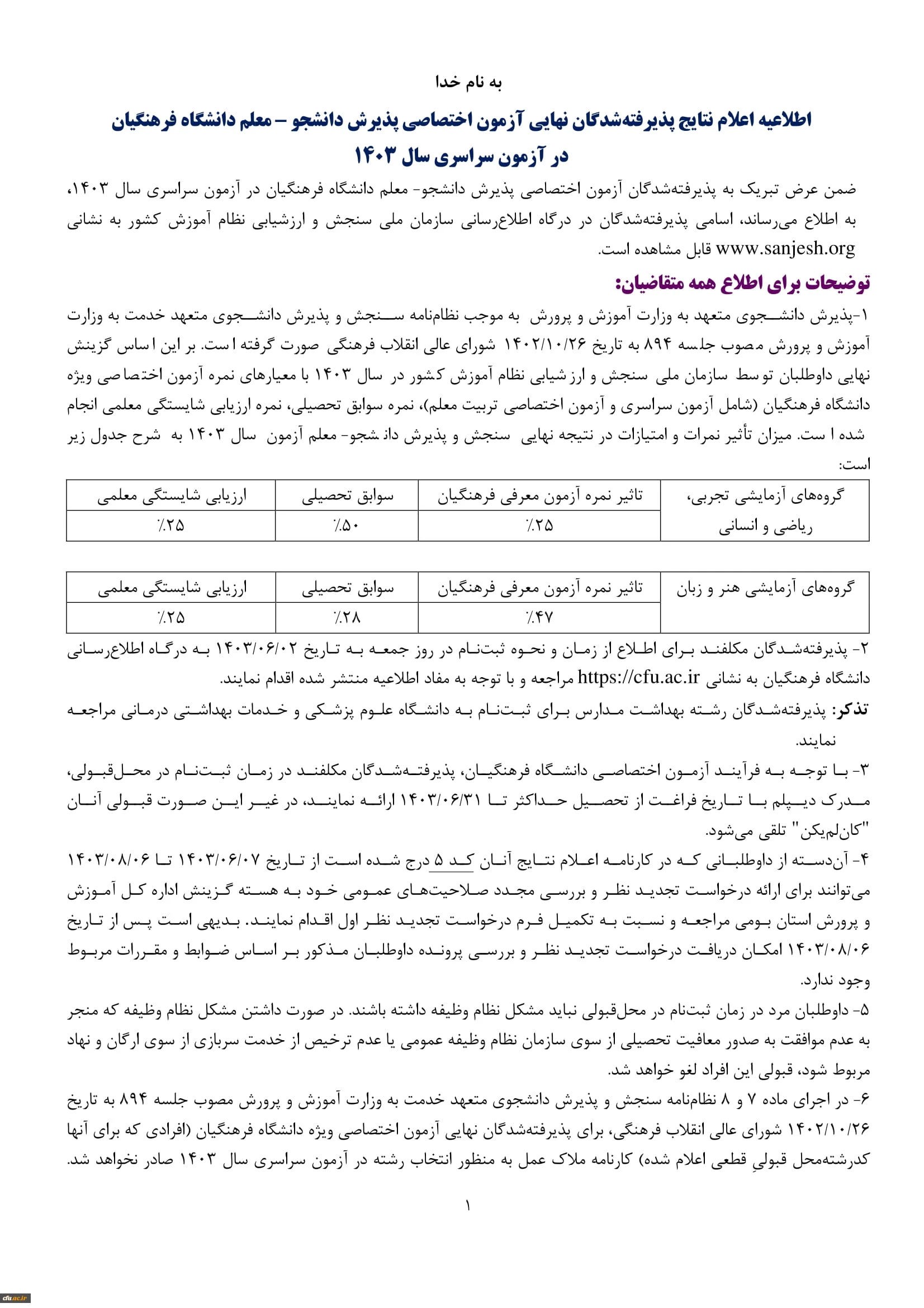 اعلام نتایج پذیرفته شدگان نهایی آزمون اختصاصی پذیرش دانشجومعلم دانشگاه فرهنگیان در آزمون سراسری سال 1403 2