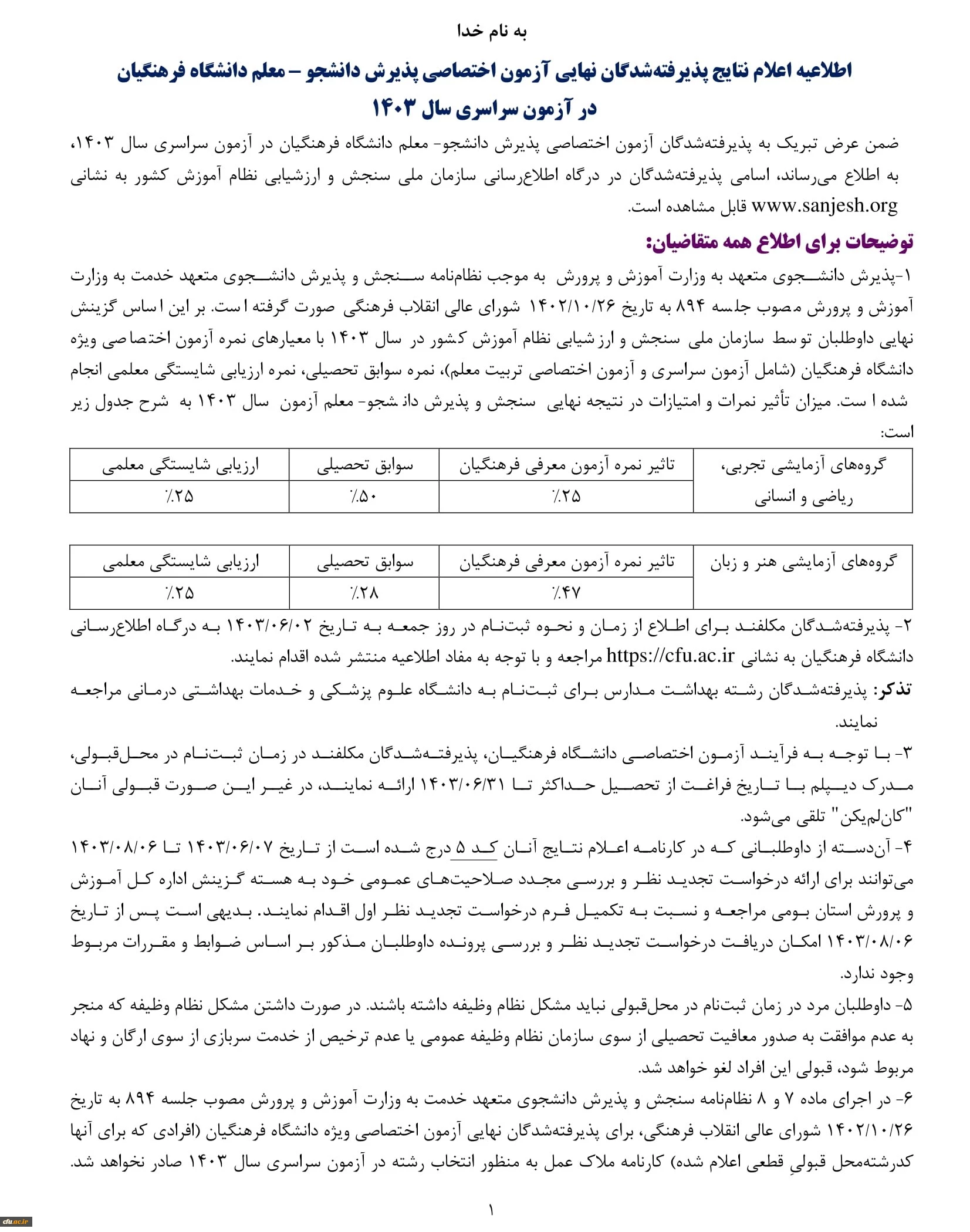 اعلام نتایج پذیرفته شدگان نهایی آزمون اختصاصی پذیرش دانشجومعلم دانشگاه فرهنگیان در آزمون سراسری سال 1403 2