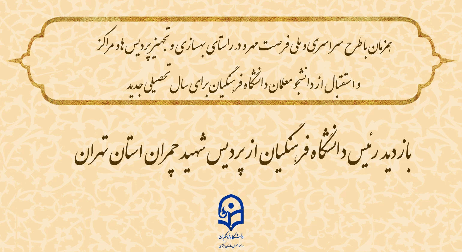 امتیاز دهید : بازدید رئیس دانشگاه فرهنگیان از پردیس شهید چمران استان تهران همزمان با طرح سراسری و ملی فرصت مهر و در راستای بهسازی و تجهیز پردیس ها و مراکز و استقبال از دانشجو معلمان دانشگاه فرهنگیان برای سال تحصیلی جدید سهشنبه 20 شهریور 1403 ساعت 13:28