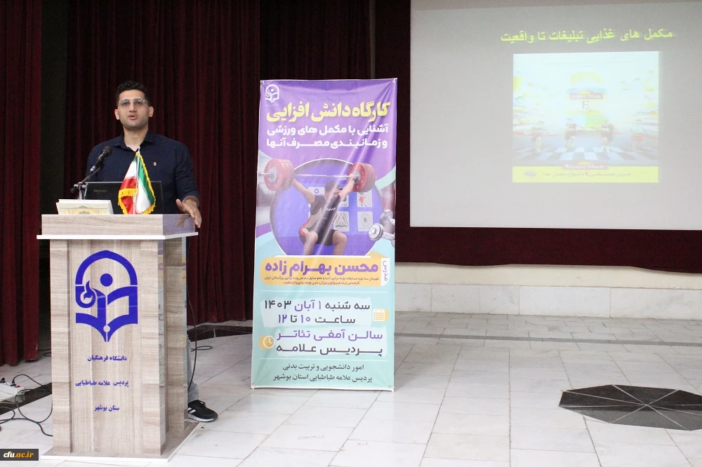 با حضور قهرمان سه دوره مسابقات وزنه برداری آسیا؛ برگزاری کارگاه آشنایی با مکمل های ورزشی در دانشگاه فرهنگیان استان بوشهر 3
