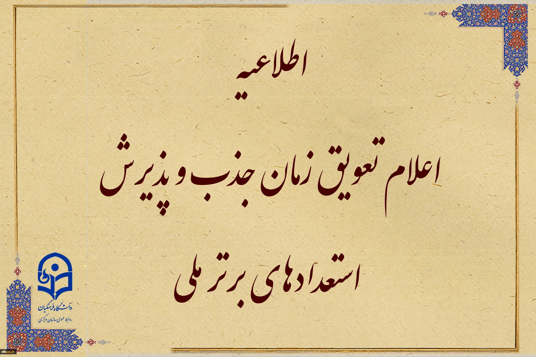 اطلاعیه اعلام تعویق زمان جذب و پذیرش استعدادهای برتر ملی 2