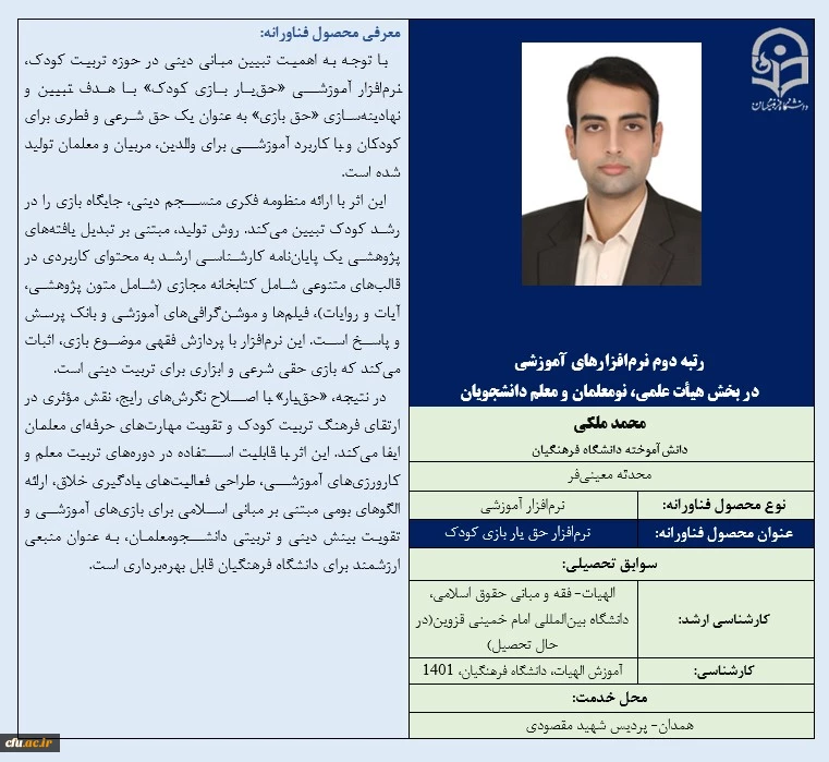 رتبه دوم نرم افزارهای آموزشی در بخش هیأت علمی، نومعلمان و معلم دانشجویان-آقای محمد ملکی 2