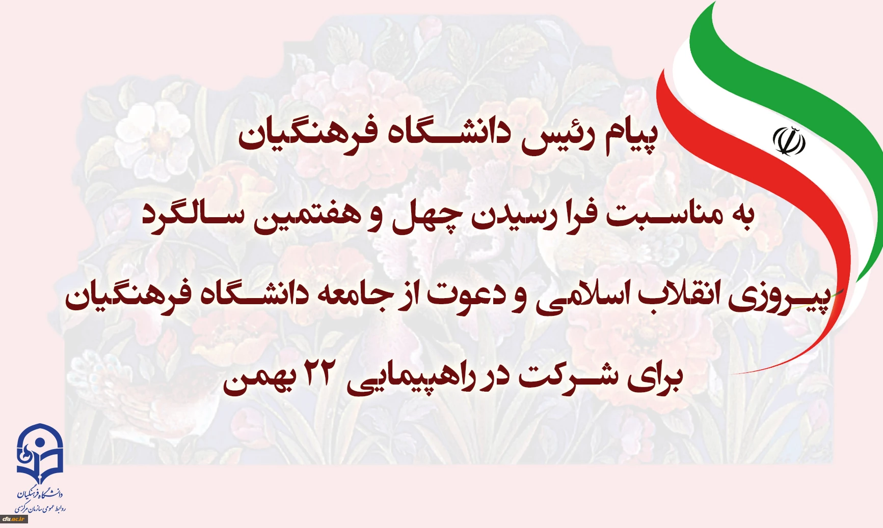 پیام رئیس دانشگاه فرهنگیان به مناسبت فرا رسیدن چهل و هفتمین سالگرد پیروزی انقلاب اسلامی و دعوت از جامعه دانشگاه فرهنگیان برای شرکت در راهپیمایی 22 بهمن 2